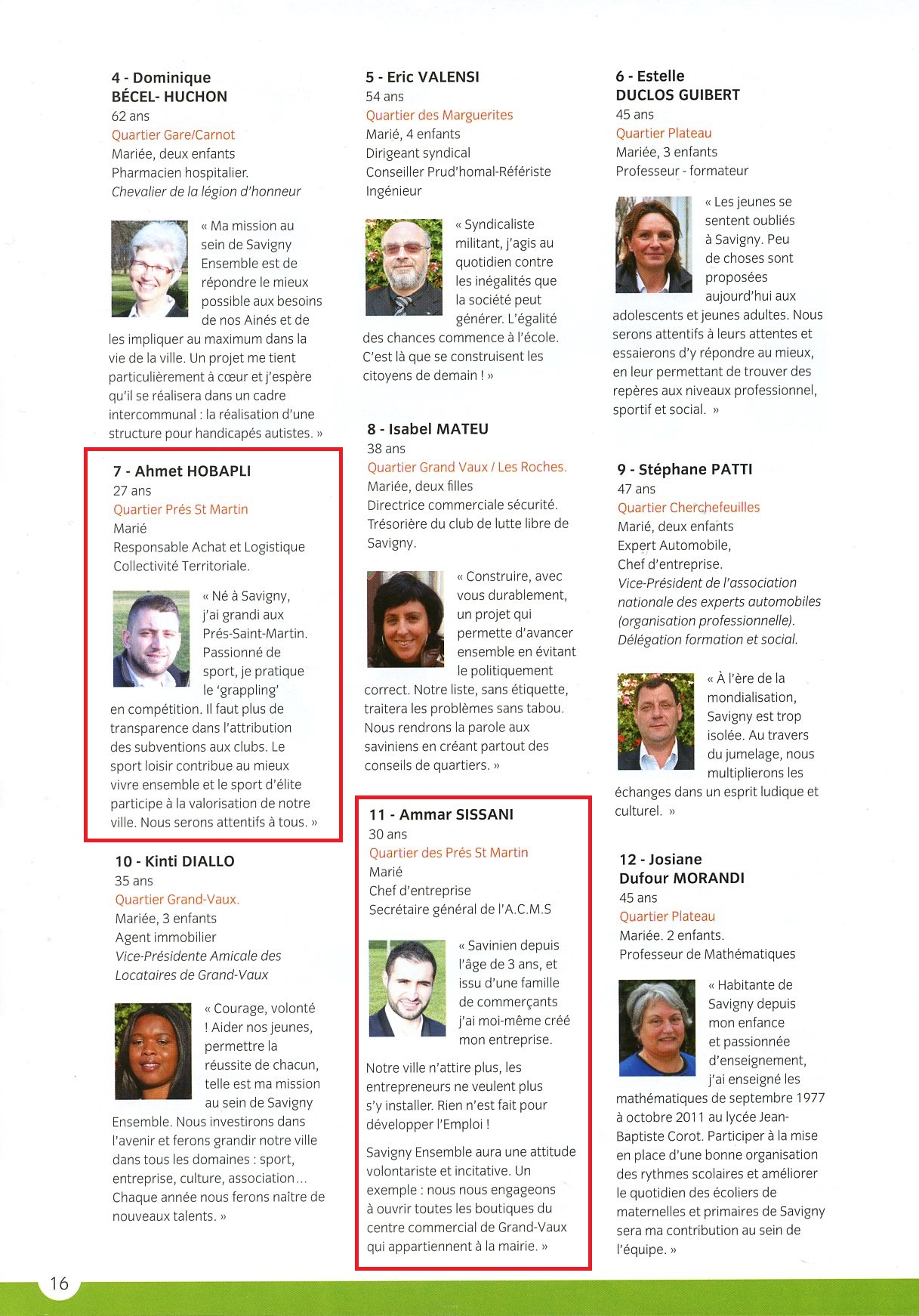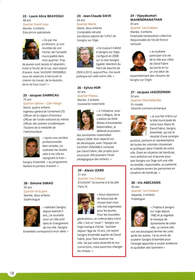 Je rappelle à ce stade que Ahmet HOBAPLI, Ammar SISSANI et Alexis IZARD étaient tous les trois sur la liste de David FABRE en 2014. Ci-après des extraits du programme de Savigny Ensemble.