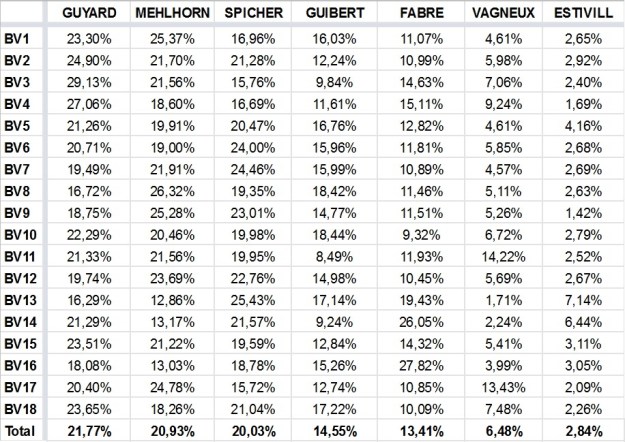 Le seul intérêt de cet article, ce sont mes jolis tableaux (que je tiens à disposition sous format exploitable). Tout le reste de l’analyse ne sera que masturbation intellectuelle partielle et partiale, d’abord parce qu’elle ignorera volontairement IZARD, BLANCHAUD et CURATOLO. Ensuite parce que je suis bien incapable de pondérer les résultats par rapport à l’effet du Covid-19 sur la mobilisation des électeurs de chaque candidat.