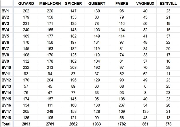 FABRE progresse à Grand-Vaux, et très légèrement dans certains quartiers pavillonnaires, d’ailleurs pas forcément ceux où SPICHER faisait un gros score. Mais il s’effondre partout ailleurs pour un électorat qui semble aller renforcer VAGNEUX et DEFRÉMONT. Toujours est-il que l’électorat de SPICHER ne l’a pas suivi.