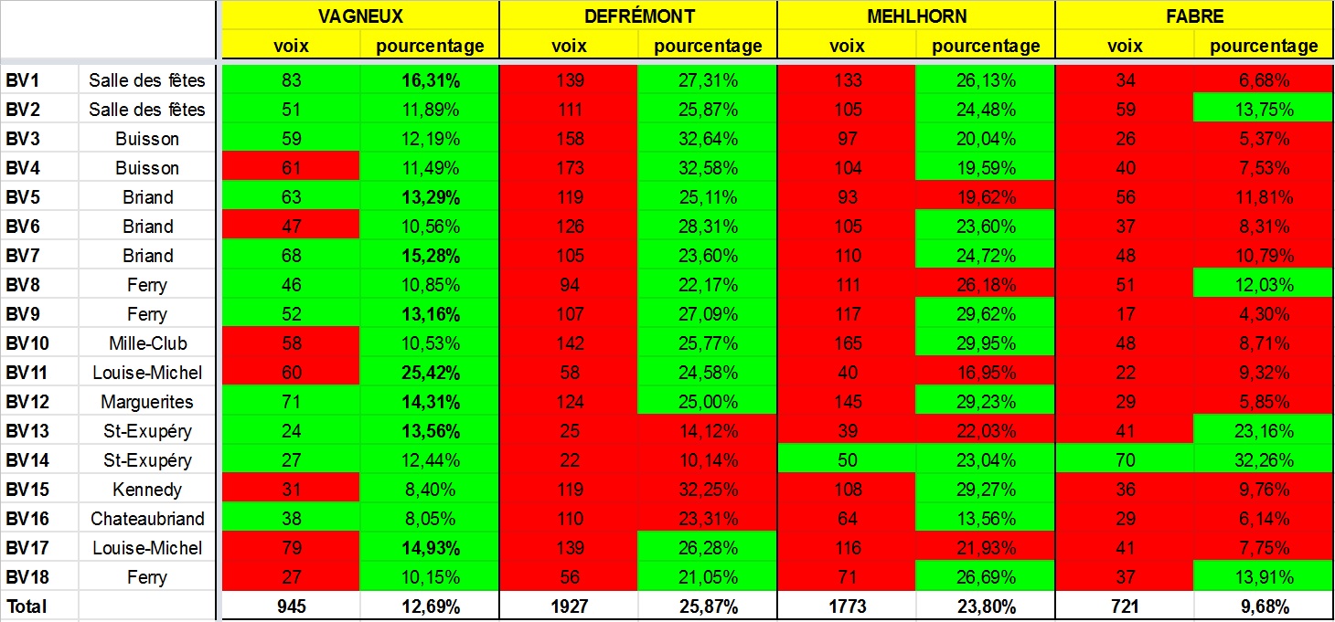 VAGNEUX double son score quasiment partout par rapport à 2014. Ses meilleurs résultats hormis chez lui à Clair-Village et aux Gâtines proviennent des quartiers où il a été actif sur l’urbanisme (le BV1, c’est la rue des giroflées, le BV7, c’est la rue des perdrix…)