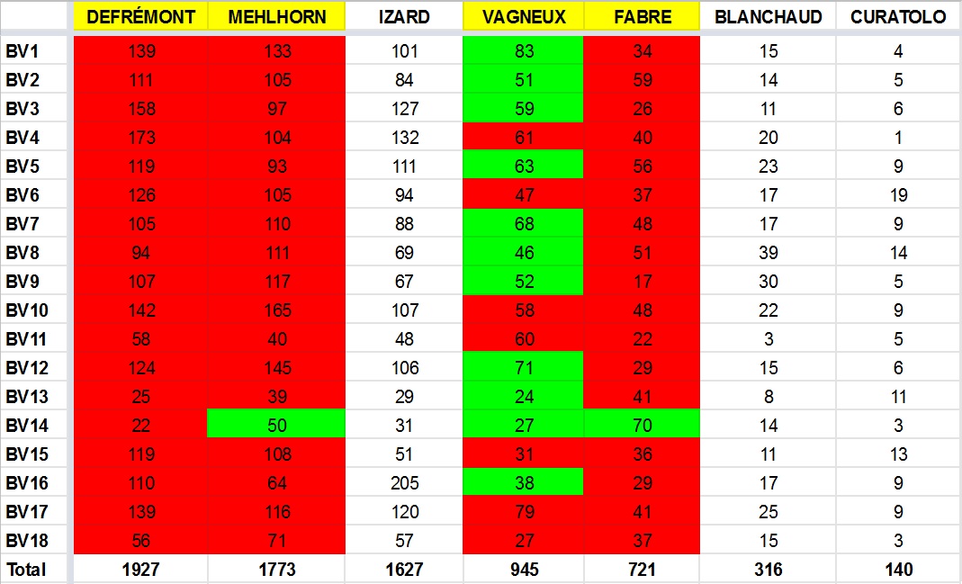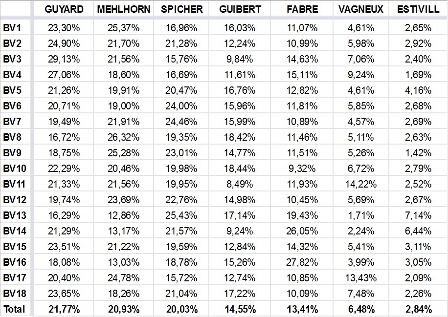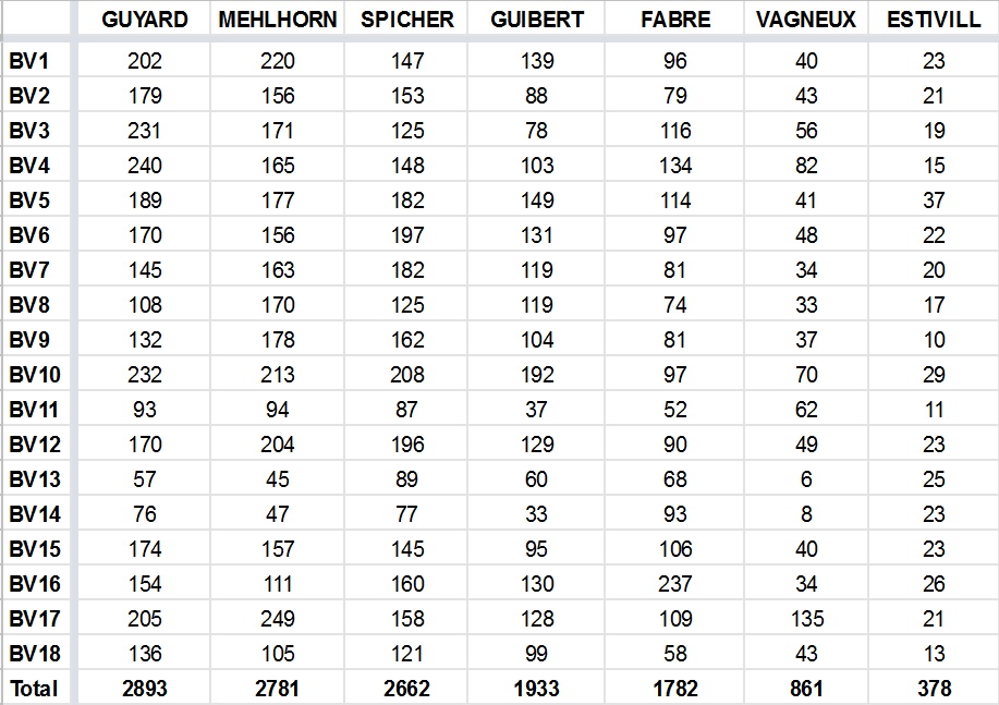 Le seul intérêt de cet article, ce sont mes jolis tableaux (que je tiens à disposition sous format exploitable). Tout le reste de l’analyse ne sera que masturbation intellectuelle partielle et partiale, d’abord parce qu’elle ignorera volontairement IZARD, BLANCHAUD et CURATOLO. Ensuite parce que je suis bien incapable de pondérer les résultats par rapport à l’effet du Covid-19 sur la mobilisation des électeurs de chaque candidat.