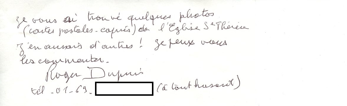 Roger DUPUIS était effectivement un pilier de la paroisse sainte-Thérèse, s’occupant notamment des comptes et des travaux, mais aussi et surtout de l’organisation de la fête d’hiver et des kermesses, sur le terrain qui était propriété de la paroisse et qui a été cédé pour partie depuis pour faire la crèche des Dauphins, la maison de quartier du Plateau Éole et l’aire de jeux devant le square Brassens (le 111), d’où le nom de « Jardins de sainte-Thérèse ».