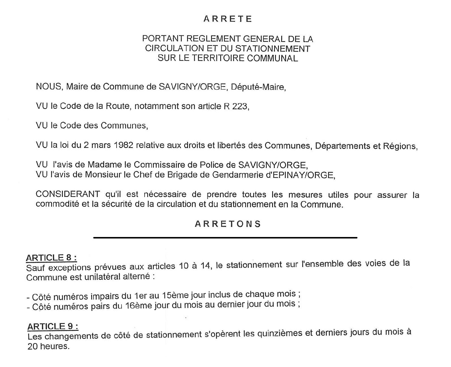 Enfin, c’est selon l’article 9 du règlement général de la circulation et du stationnement sur le territoire communal de Savigny-sur-Orge du 21 février 1994…