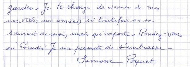 Je viens d’apprendre le décès de Simone POQUET. D’un coup, c’est un vide qui m’envahit, je n’ai plus goût à rien. Je me précipite sur mon ordinateur pour retrouver les scans des derniers courriers que nous avons échangés et je tombe sur cette phrase qui me fait retrouver le sourire : Rendez-vous au « Paradis ». Simone nous a quittés ce lundi matin (06 avril 2020) des suites d’une infection au Covid-19. Elle aurait eu 90 ans ce 15 septembre.