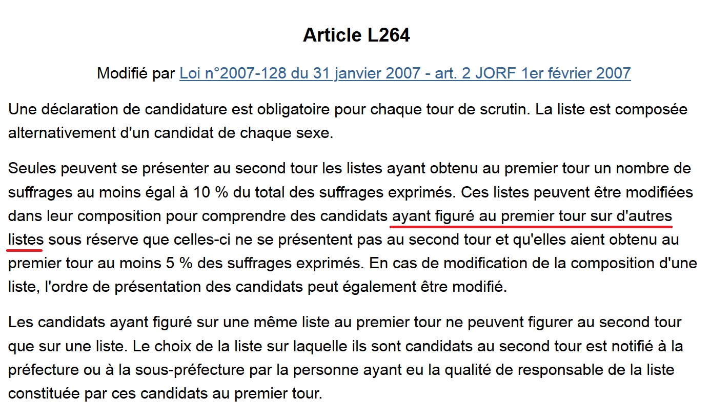 « Ces listes [pouvant se présenter au second tour] peuvent être modifiées dans leur composition pour comprendre des candidats ayant figuré au premier tour sur d’autres listes sous réserve que celles-ci ne se présentent pas au second tour et qu’elles aient obtenu au premier tour au moins 5 % des suffrages exprimés.«