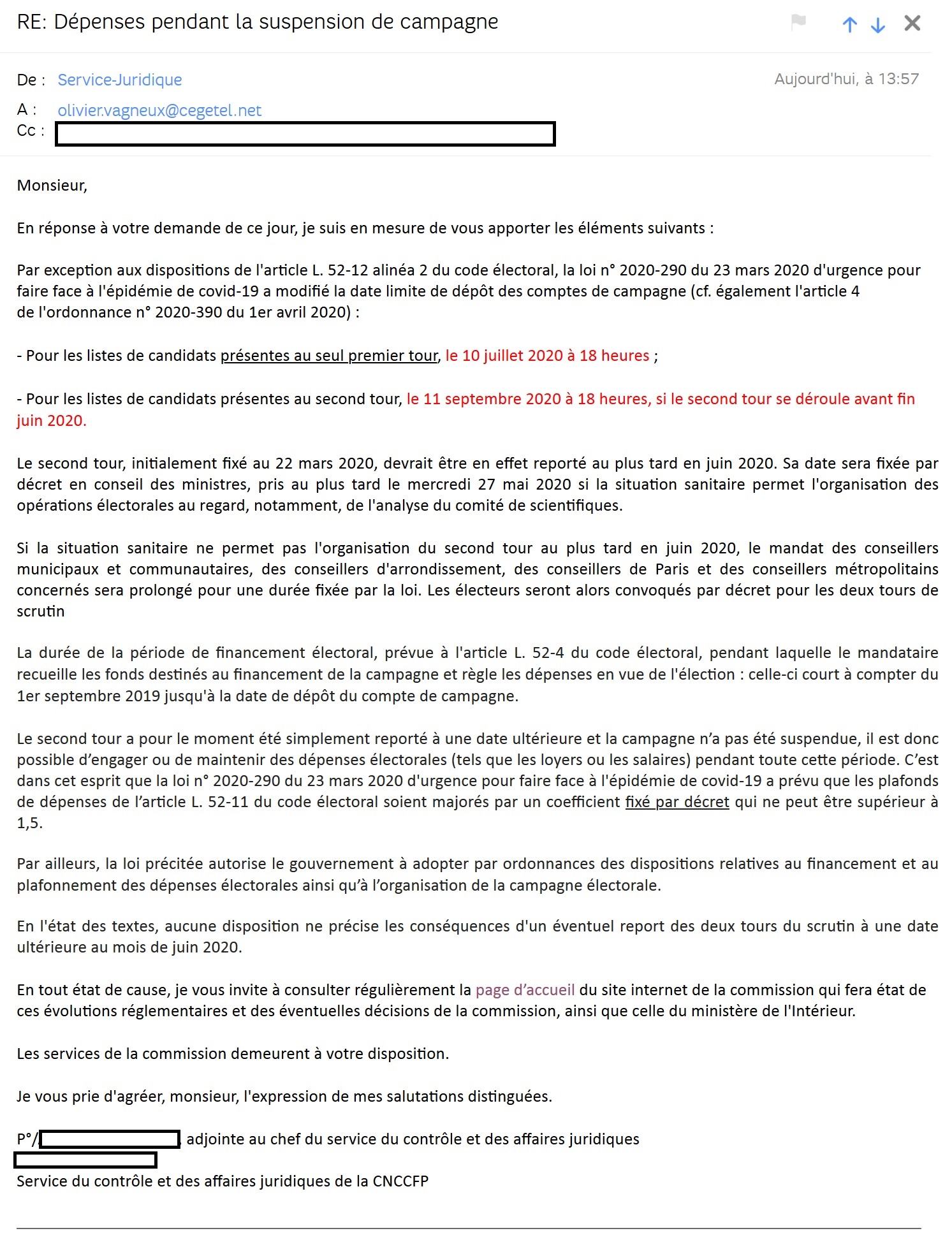 La Commission rappelle enfin qu’en l’état des textes, aucune disposition ne précise les conséquences d’un éventuel report des deux tours du scrutin à une date ultérieure au mois de juin 2020. Surtout, elle invite à consulter régulièrement la page d’accueil de son site internet.