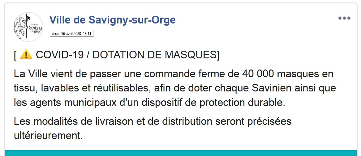 Pendant ce temps, plusieurs maires de l’Essonne ont déjà distribué des masques à leur population depuis deux semaines, ce qui à mon sens ne la protège pas plus, mais donne à leurs administrés un sentiment de plus grande prévoyance.