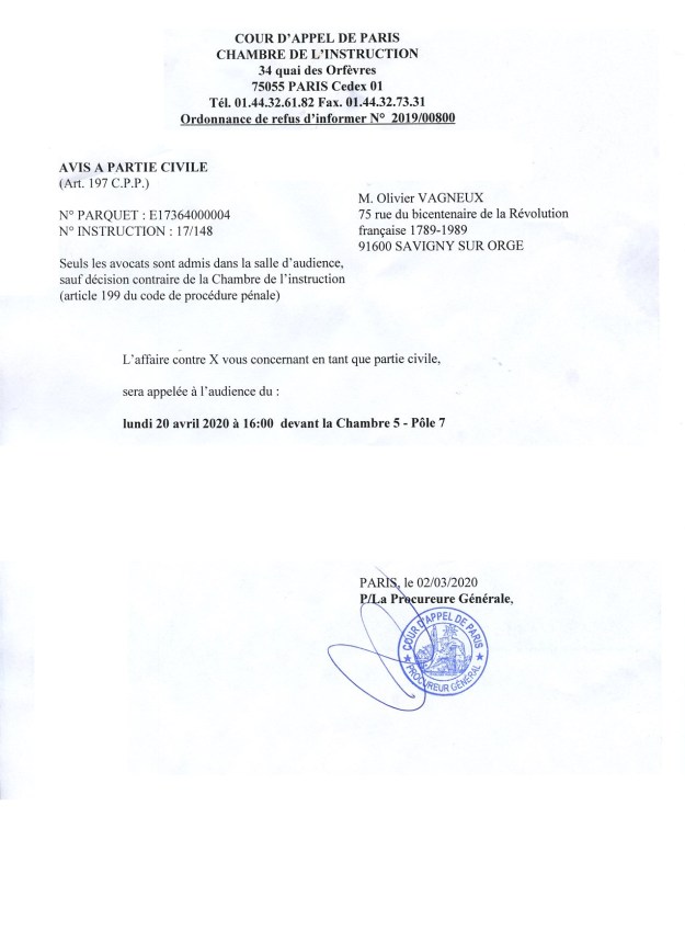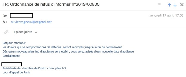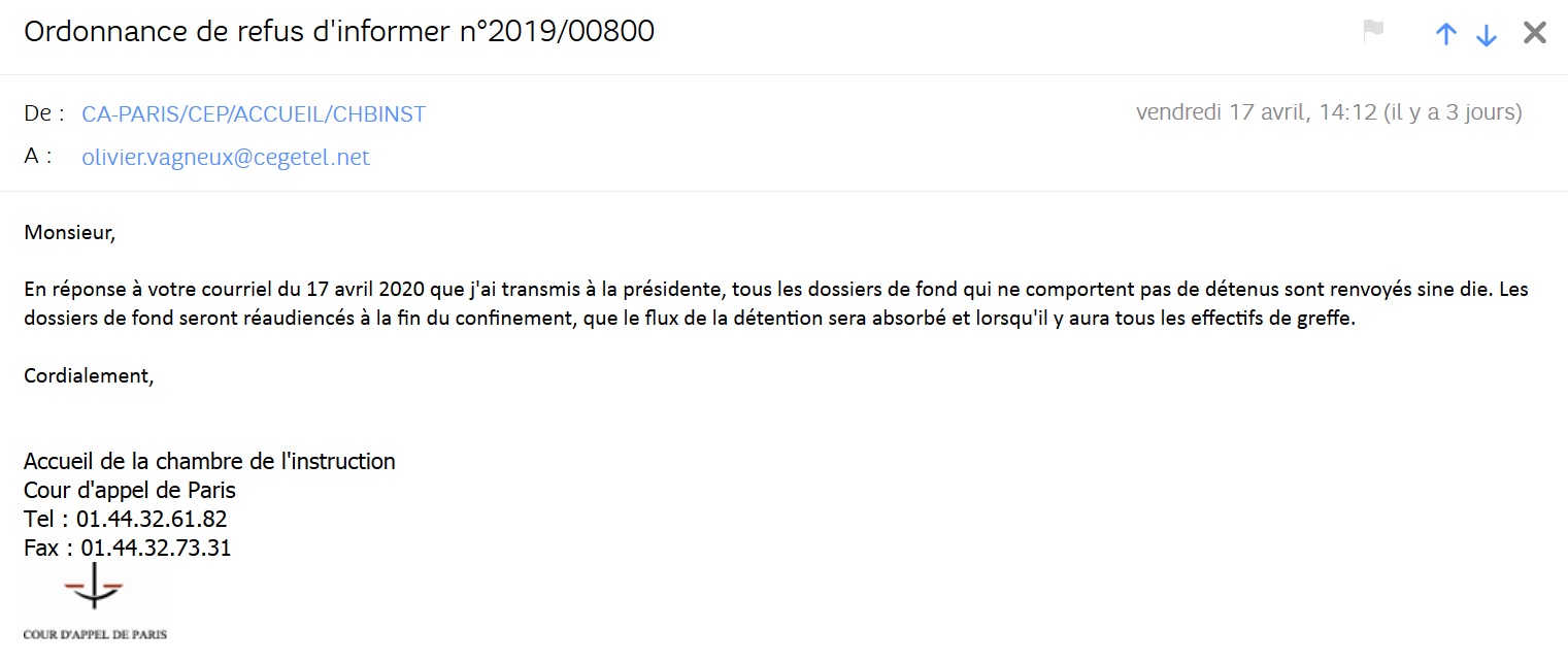 Normalement, s’il n’y avait pas eu le confinement lié au Covid-19, j’aurais dû être cette après-midi du lundi 20 avril 2020 à la Cour d’appel de Paris pour défendre l’infirmation par la Chambre de l’instruction d’une ordonnance de refus d’informer de la doyenne des juges d’instruction près le Tribunal judiciaire d’Évry-Courcouronnes.
