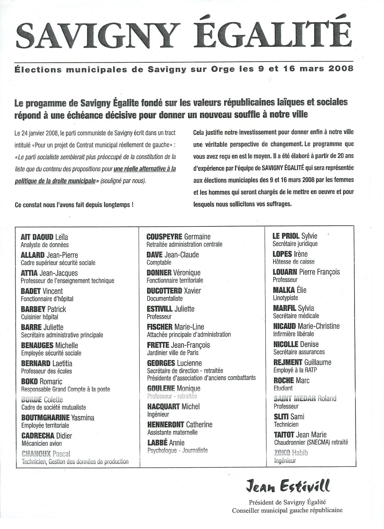 Voici la liste, dans l’ordre des colistiers, présentée par Jean ESTIVILL aux élections municipales de 2008 à Savigny-sur-Orge sous le nom de « Savigny Égalité ».
