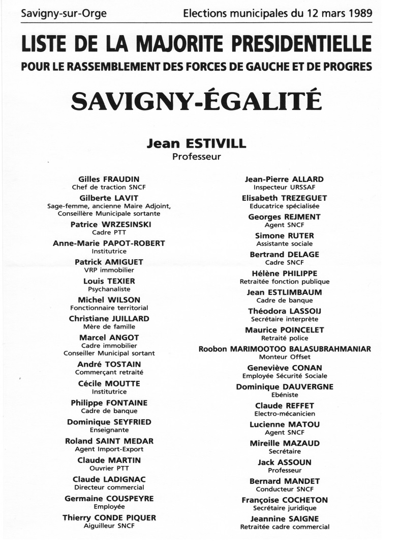 En mars 1989, Jean ESTIVILL conduisait sa première liste municipale, en dissident de la majorité présidentielle socialiste de l’époque ; les instances du Parti socialiste ayant préféré accorder l’investiture officielle à Élisabeth ROZE DES ORDONS.