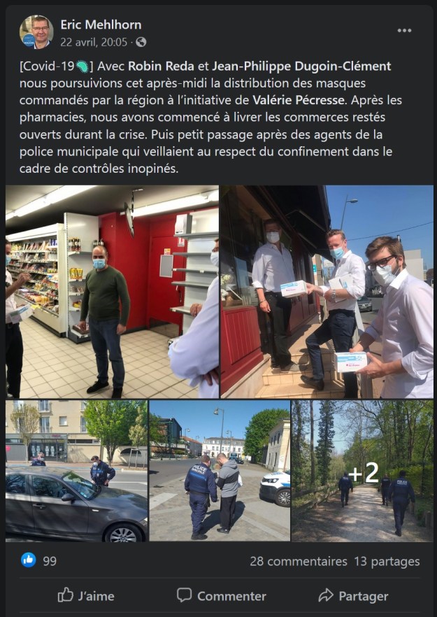 Et ce matin du 29 avril 2020, MEHLHORN était là, à la gare, avec ses colistiers. Comme la plupart des élus LR du coin, devant la gare de leur commune, pour distribuer personnellement les masques commandés avec l’argent des Franciliens pour les Franciliens. Non sans remercier cette chère Valérie d’avoir juste fait son travail, et en lui en attribuant tout le mérite, espérant alors qu’un petit peu de cette gloire rejaillisse sur eux et leur apporte quelques suffrages.