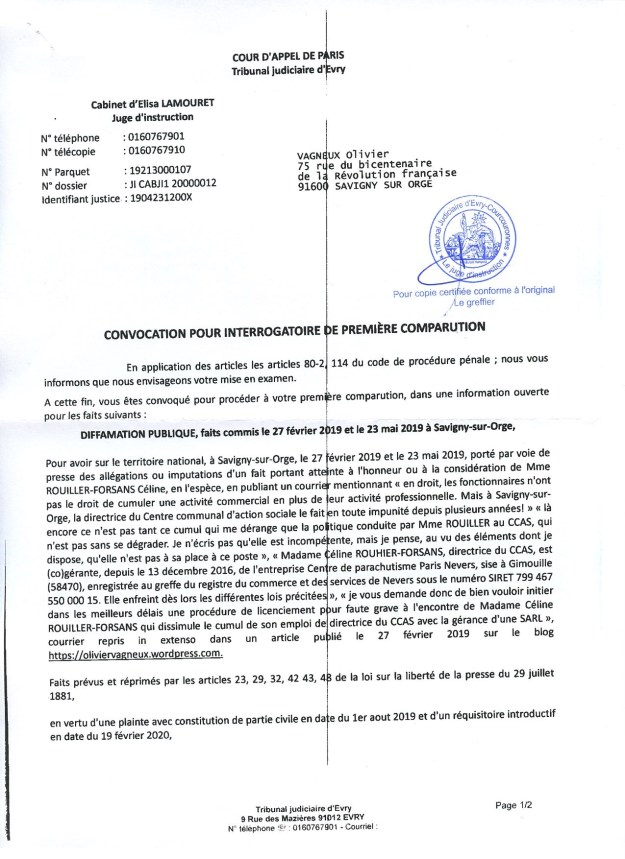 Me faut-il déjà préparer la requête en annulation, et la demande de démise en examen, au vu des deux énormités inscrites dans la convocation de la juge d’instruction, si toutefois celles-ci pouvaient rendre nulles, d’une quelconque façon, la procédure ?