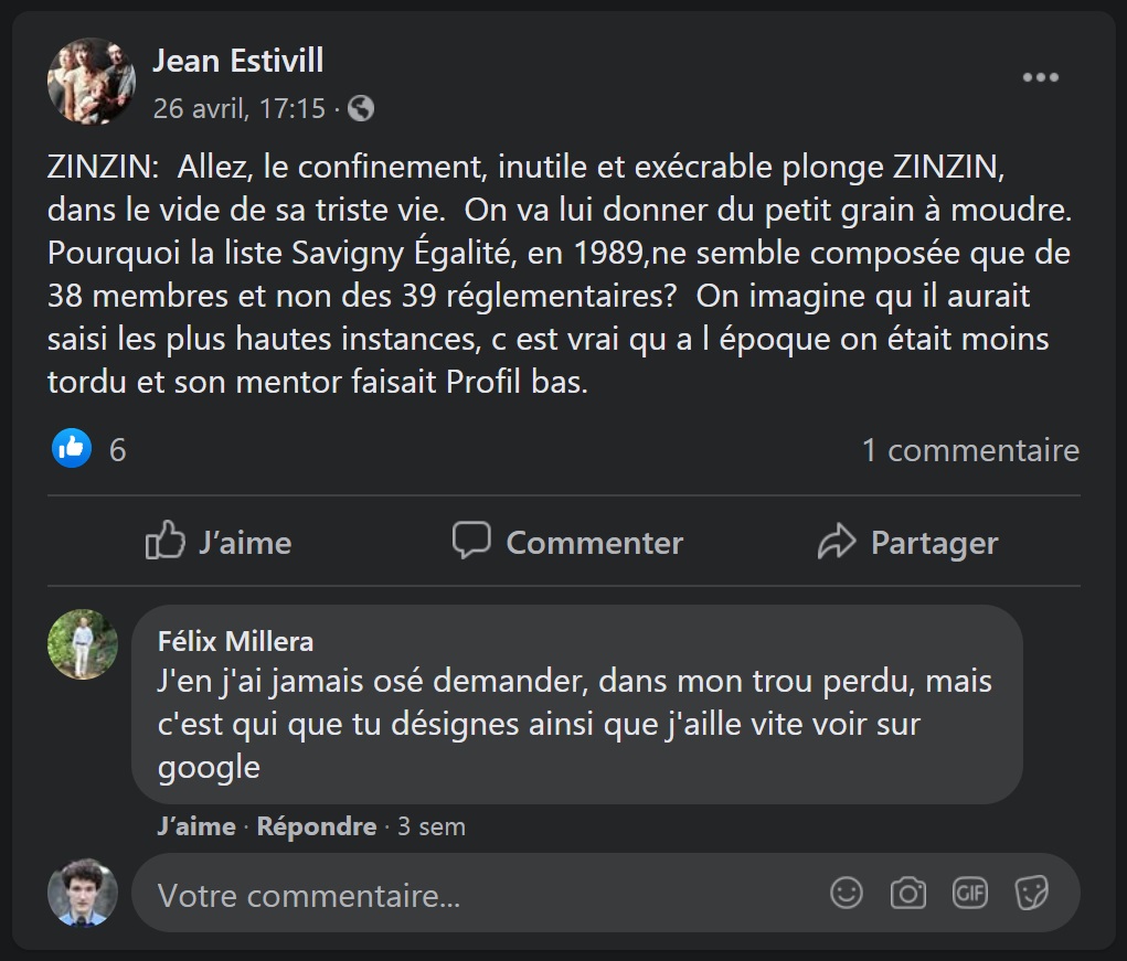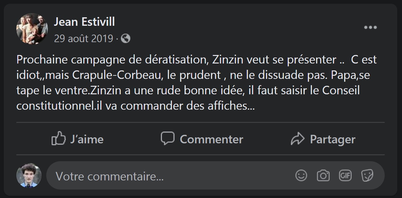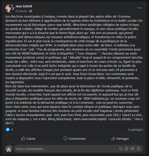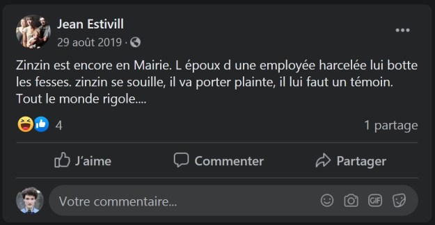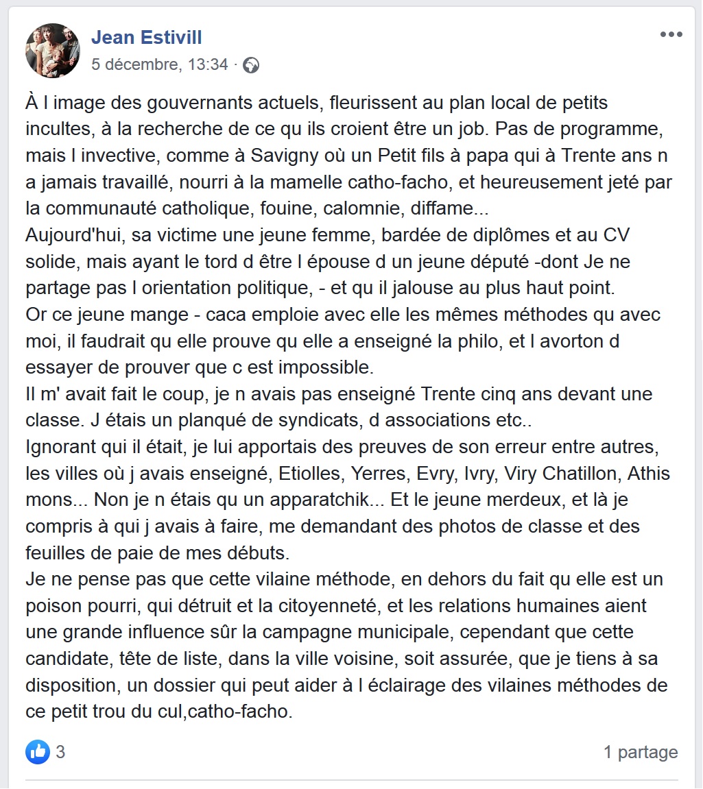 Le 31 janvier 2020, je déposais une plainte simple pour injures publiques à l’encontre de Georges DURAND, colistier d’Éric MEHLHORN, ancien agent communal qui siégeait au CHSCT (devenu CSE) ; lequel aime à se répandre contre ma personne sur les réseaux sociaux, tout en me faisant de grands sourires quand nous tractons au même endroit, quand il ne s’écrasait pas discrètement les dernières fois lorsque je le croisais en mairie…