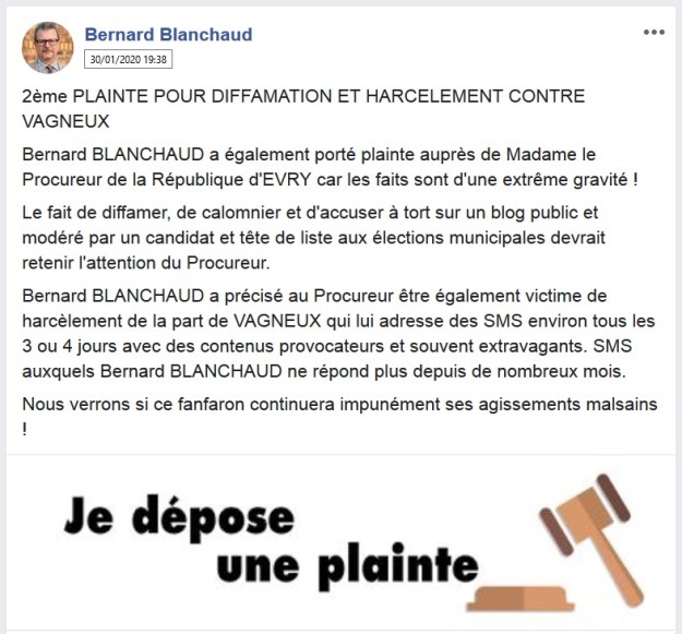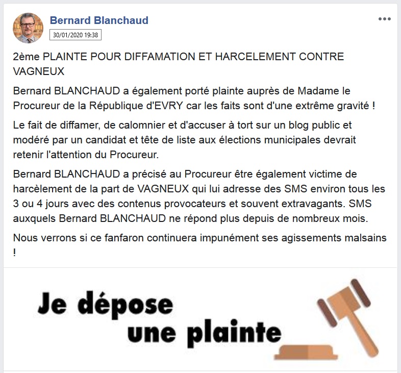 Enfin, la troisième et dernière fusionne mes deux courriers de plainte contre Bernard BLANCHAUD pour dénonciation calomnieuse car il m’a accusé, à tort et en sachant au fond de lui que ce n’est pas vrai, mais parce qu’il est en colère, de l’avoir diffamé, puis carrément de le harceler.