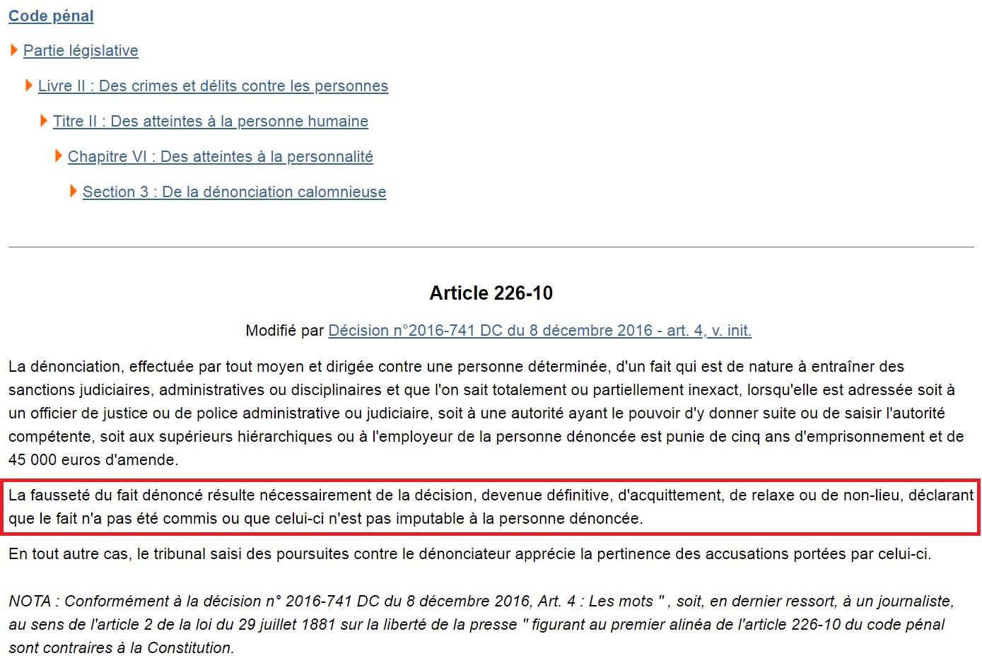 Or, d’après le deuxième alinéa de l’article 226-10 du code pénal, la fausseté du fait dénoncé résulte d’une décision de Justice déclarant que « le fait que na pas été commis ou qu’il n’est pas imputable à la personne dénoncée ».