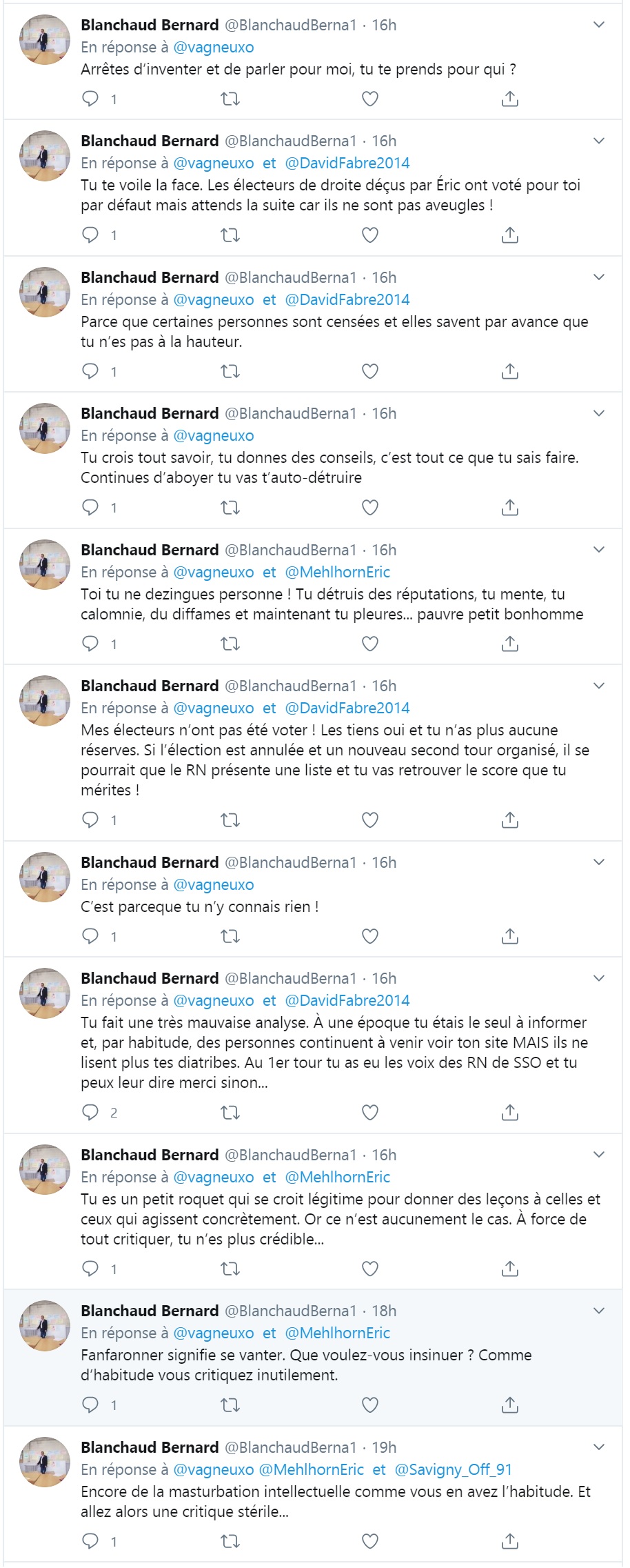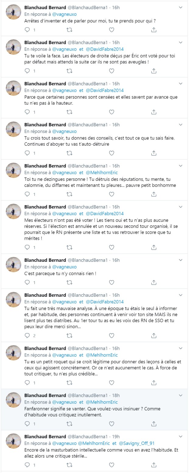 De toute façon, avec David FABRE, ils sont persuadés que l’élection leur a été volée, et qu’elle sera rejouée d’ici un an. Ce qui est dommage est que j’appréciais bien Bernard, mais qu’il est complètement parti en vrille. Gageons donc qu’il arrêtera tout lorsque le recours de David pour faire annuler l’élection sera rejeté par le Tribunal administratif.