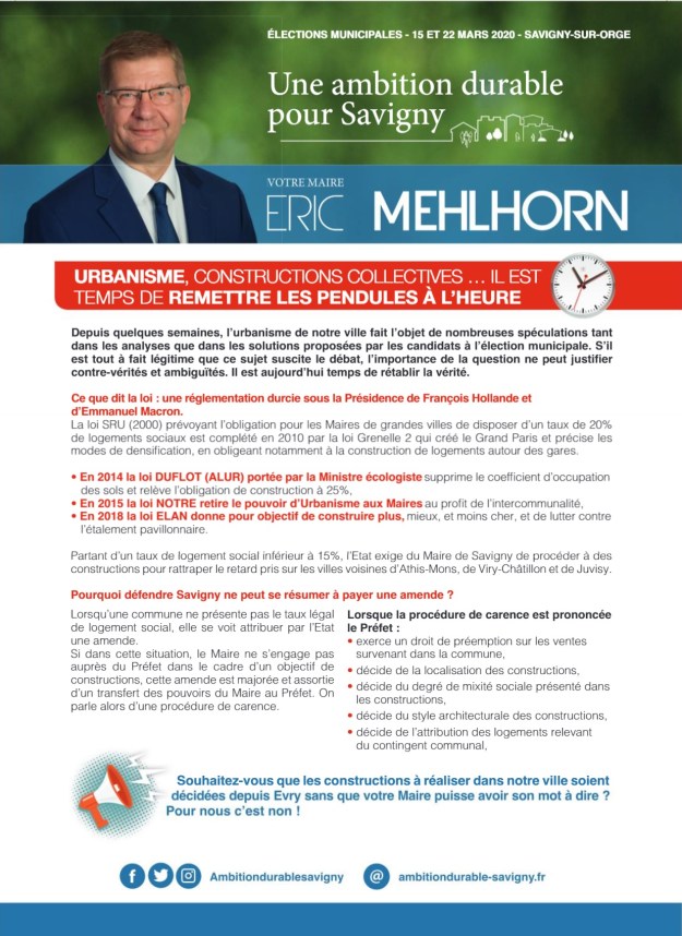 Et puis évidemment, ne pas dire que la droite parlementaire dans l’opposition (RÉDA ?) ne fait rien contre l’obligation d’un quota de 25 %, et que dans la même logique de MEHLHORN qui nous défend en bétonnant, il est fort probable que ce soit la droite elle-même qui pousse à passer à 30 %, à l’instar de Valérie PÉCRESSE dans le Schéma directeur régional !