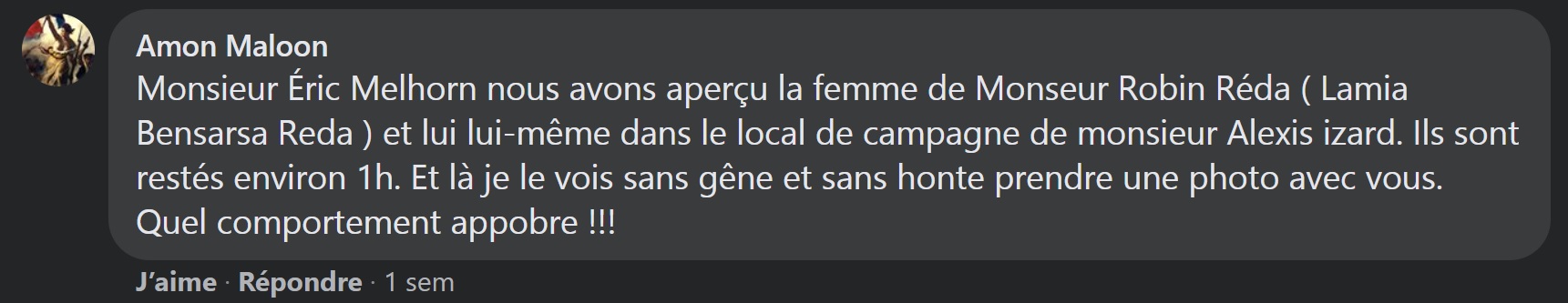 L’information, qui n’a pas pu être vérifiée, est donnée par un troll qui se fait passer pour un militant LR déçu qui va voter pour IZARD. À noter d’ailleurs qu’il utilise la même photo de profil que le sympathisant LR Sébastien VEILLON. Elle n’est cependant niée par personne, et possède tout ce qu’il faut pour être naturellement crédible, tant RÉDA méprise ouvertement MEHLHORN, et tant MEHLHORN se retrouve seul, lâché par tous et de toute part.
