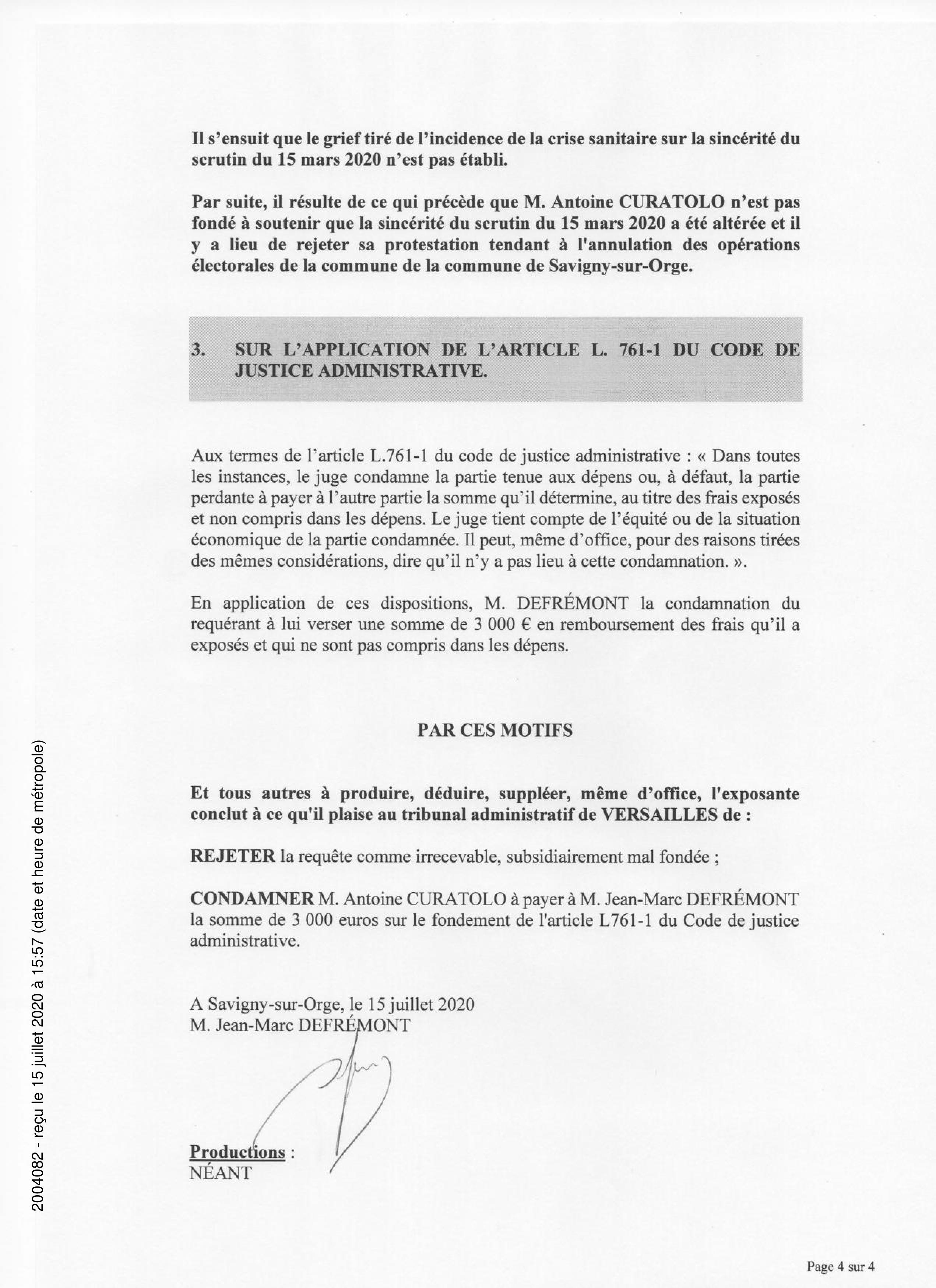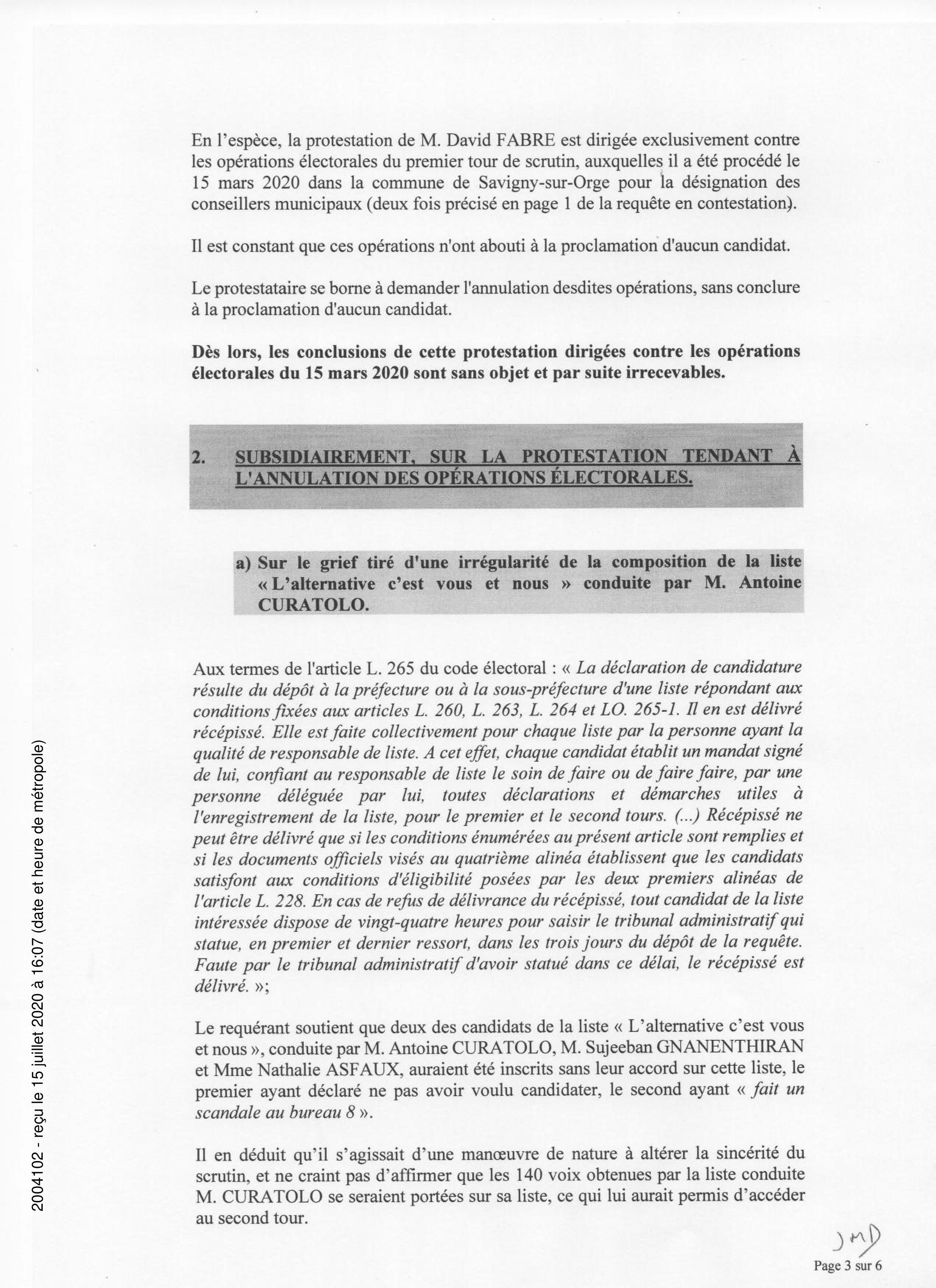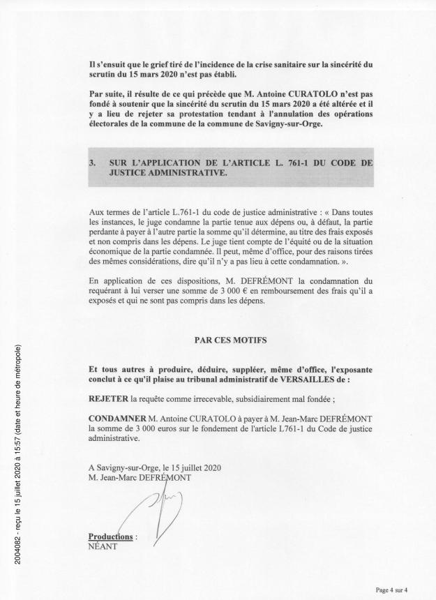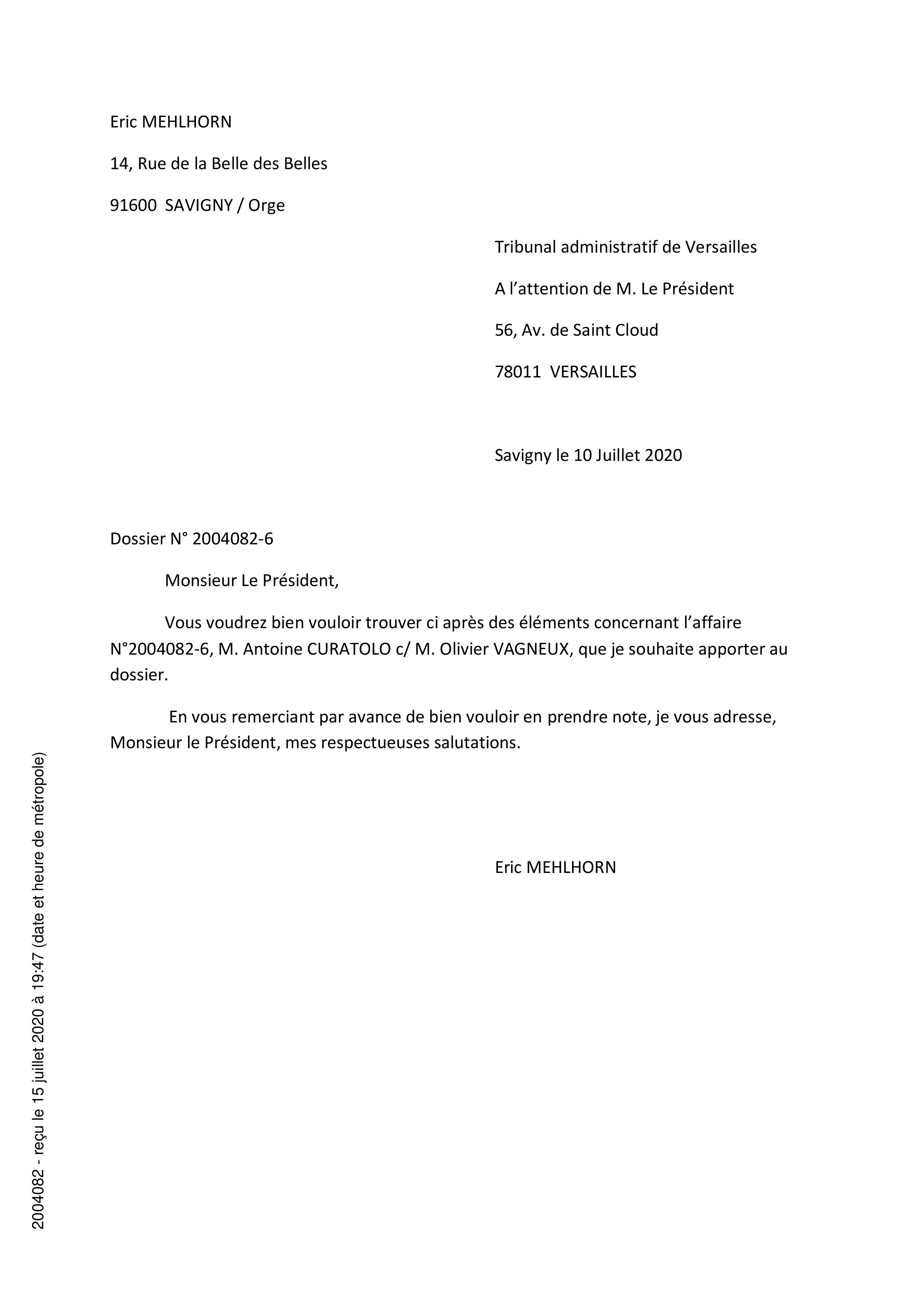 De manière plus étonnante, Éric MEHLHORN, qui avait commencé à aller démarcher les vieux pour trouver des attestations, ne veut plus qu’on annule l’élection et il soutient le rejet de la requête de CURATOLO. Lâche jusqu’au bout…