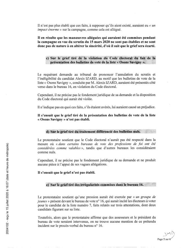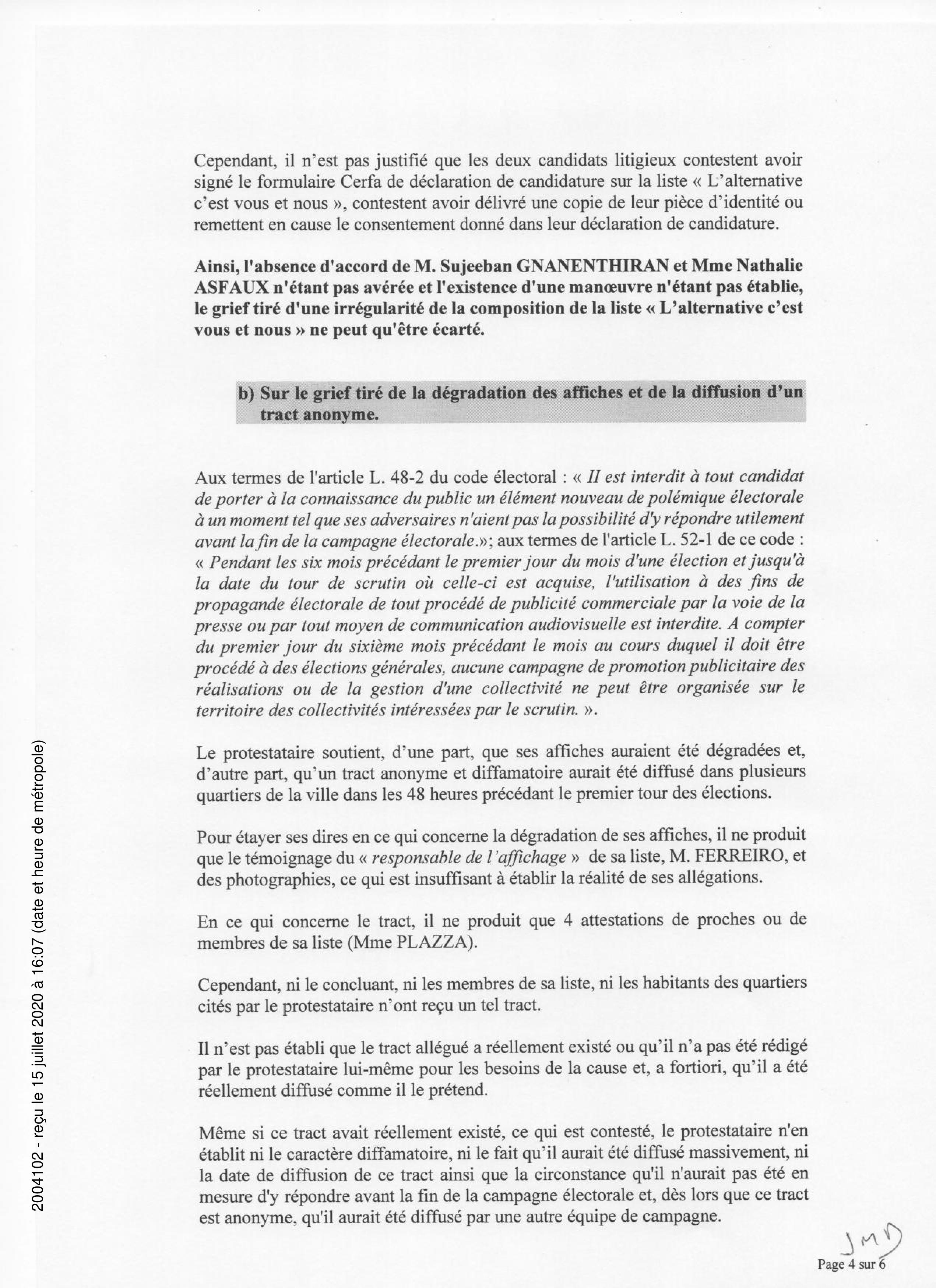 J’ai un seul argument réellement valable qui peut faire annuler l’élection : les listes d’émargement du bureau 16 révèlent qu’il y a 1/11e des signatures qui sont différentes entre les deux tours. J’en atteste pour au moins 32 personnes même si j’en ai signalé en tout et pour tout 52 au Tribunal en rajoutant 20 signatures qui me semblent personnellement litigieuses.
