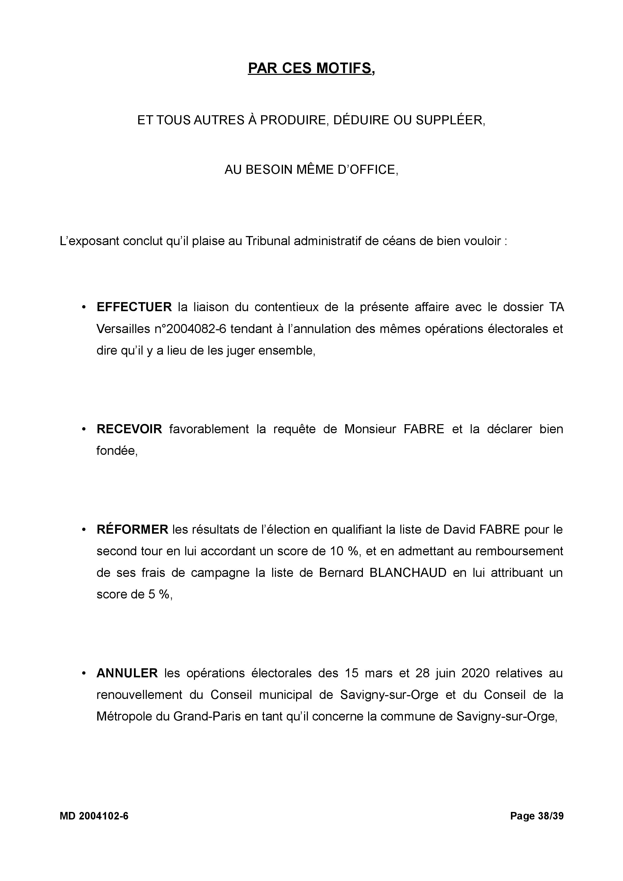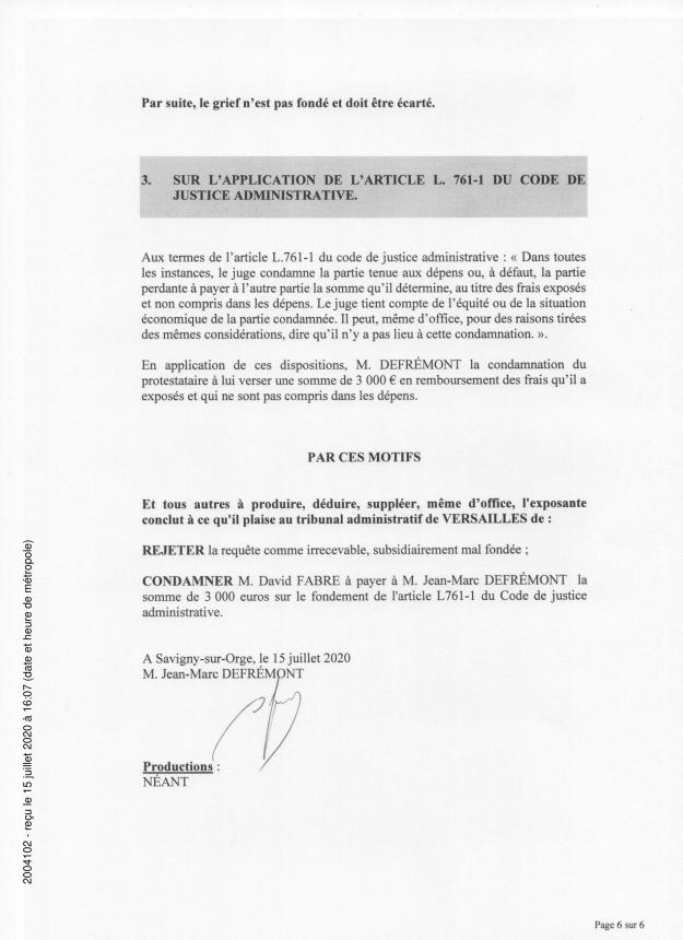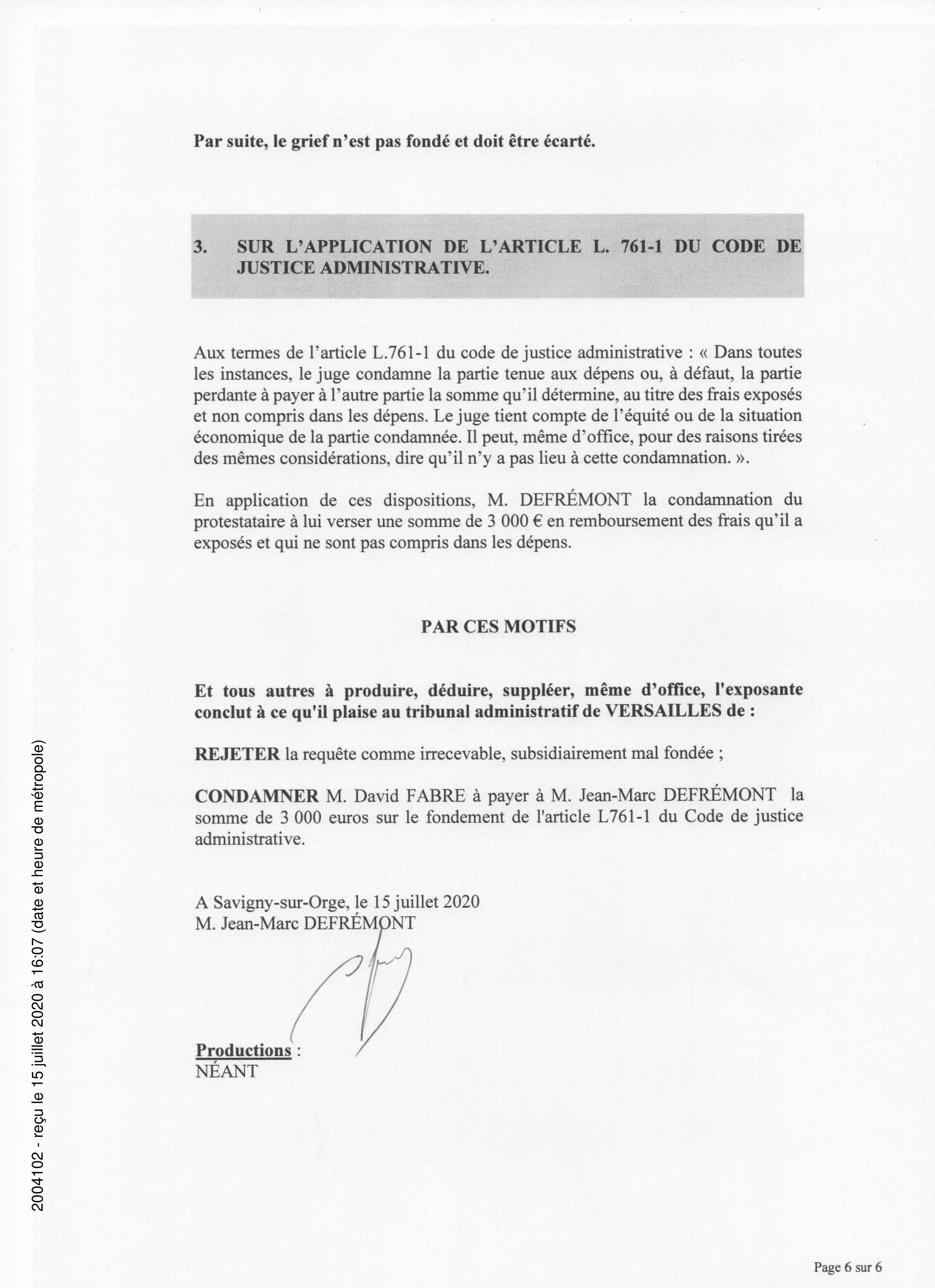 De manière évidente, Jean-Marc DEFRÉMONT demande le rejet des requêtes pour rester maire.