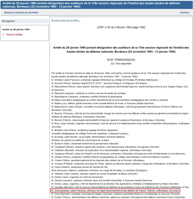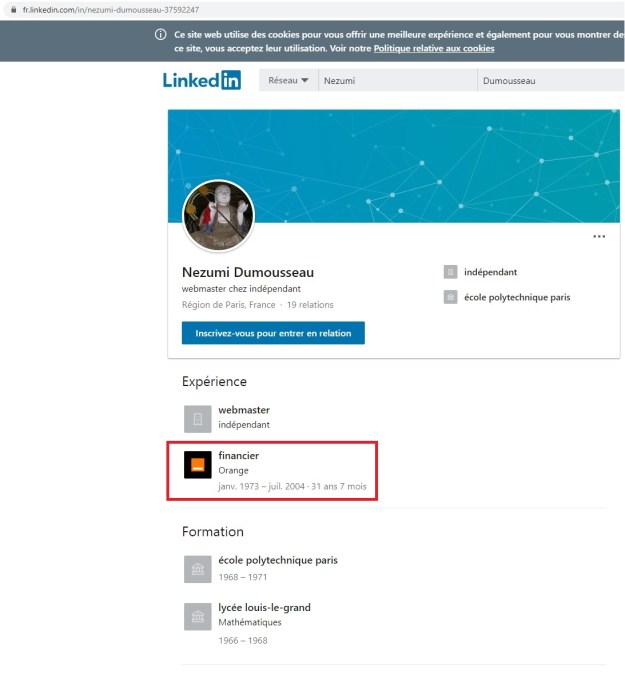 4) Sur LinkedIn, Nezumi (sans x) indique qu’il a travaillé chez Orange (anciennement France Télécom). Comme Jean-François DUMOUSSEAUX selon le Journal officiel. Ce qui correspondrait aussi au profil Facebook passé par l’ENSPT.