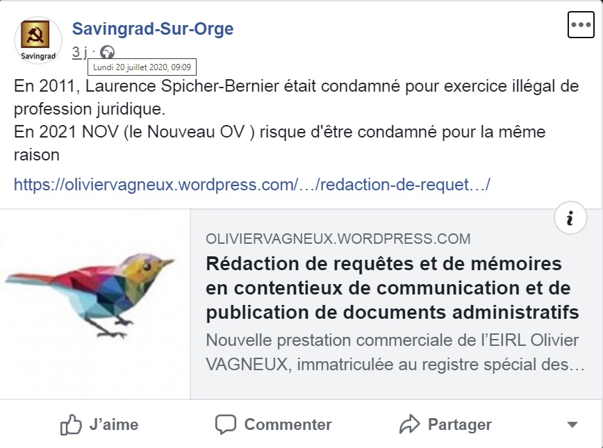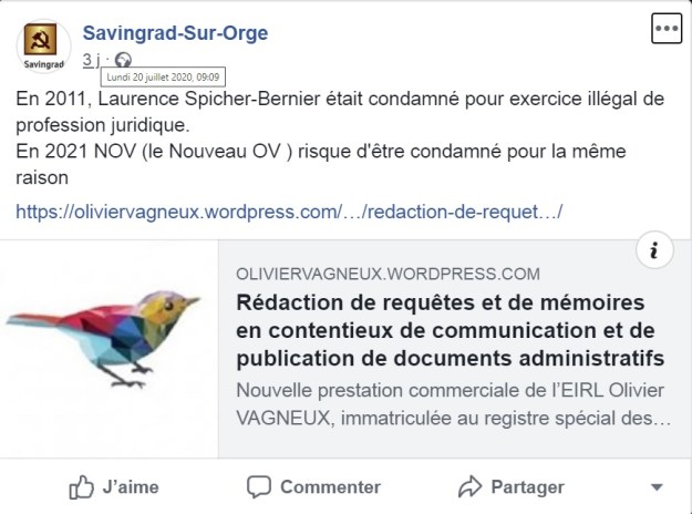 Le 20 juillet 2020, sur Facebook donc, Savingrad me dénigrait…