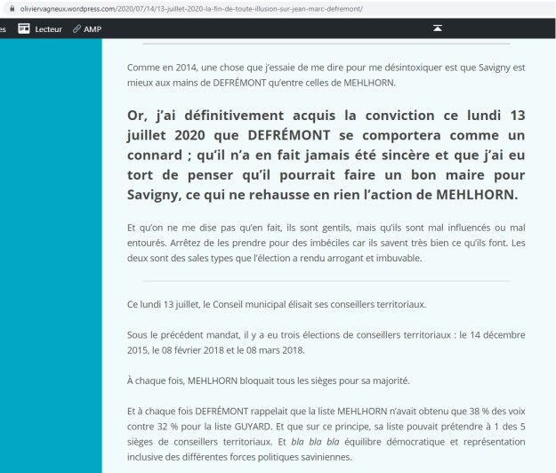 Et là pour dire que ouin ouin, je suis de gauche, j’aime la liberté d’expression, je suis Charlie, je fais des marches à Paris pour que personne ne meurt à cause de ses publications, mais si quand même la Justice pouvait faire fermer sa gueule à VAGNEUX… Parce qu’il a pré-supposé que mon attitude à venir sera comparable à celle d’un connard, littéralement un grand crétin, et surtout qu’il a percé à jour que je n’étais voltairien que sur le papier, et que si lui VAGNEUX est prêt à aller jusqu’au Conseil d’État pour défendre mon élection, moi, j’en ai grave rien à foutre de lui ; et que de toute façon, je ne reconnais, tel un mec de droite, de valeur aux actions que si elles réussissent (traduction de l’intention de Jean-Marc DEFRÉMONT exprimée dans ses propos tenus lors du conseil municipal du 13 juillet 2020.)