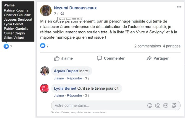 Avec ce paradoxe, que je suis quand même arrivé dernier, et assez loin derrière tout le monde, et que c’est moi qui continue d’en manger régulièrement plein la gueule. Comme si je pouvais représenter une quelconque menace avec mes 4 % du corps électoral savinien. Enfin, c’est toujours flatteur que des gens reconnaissent quand même que je vaux mieux que les autres.