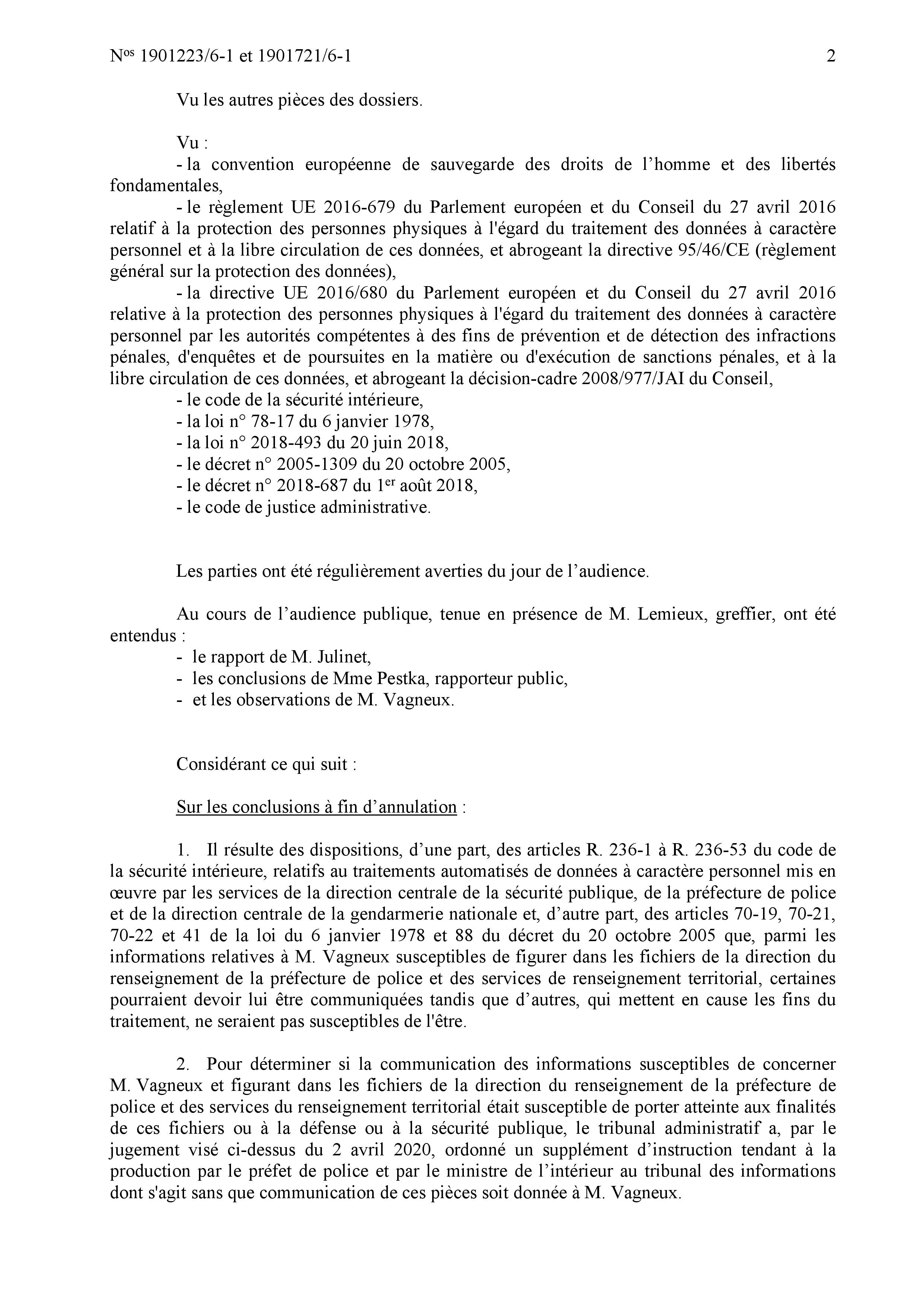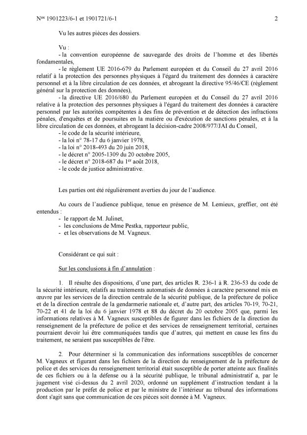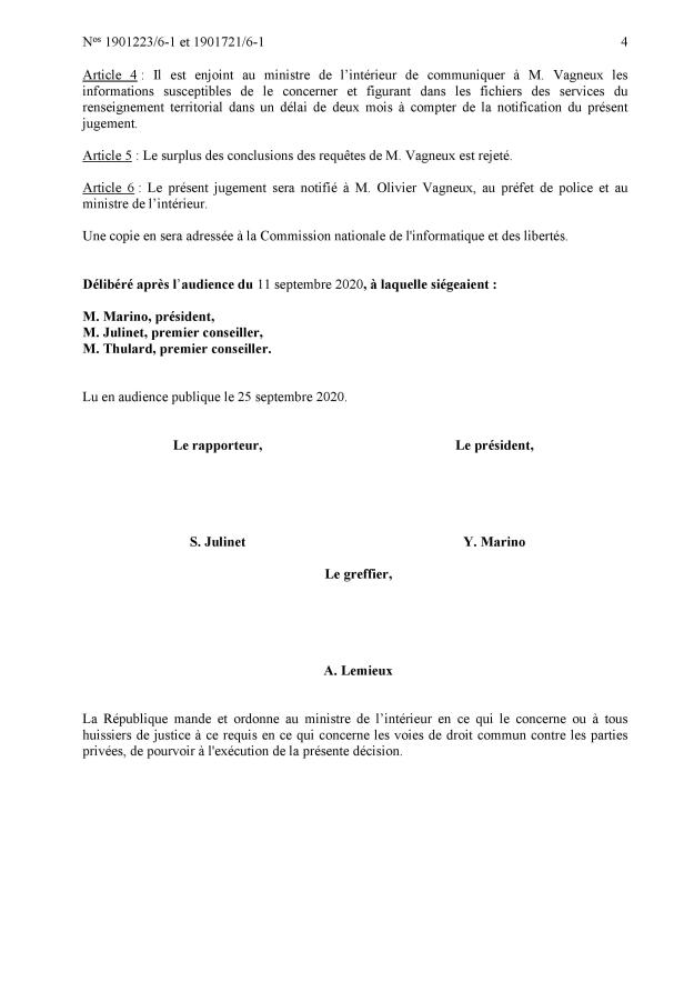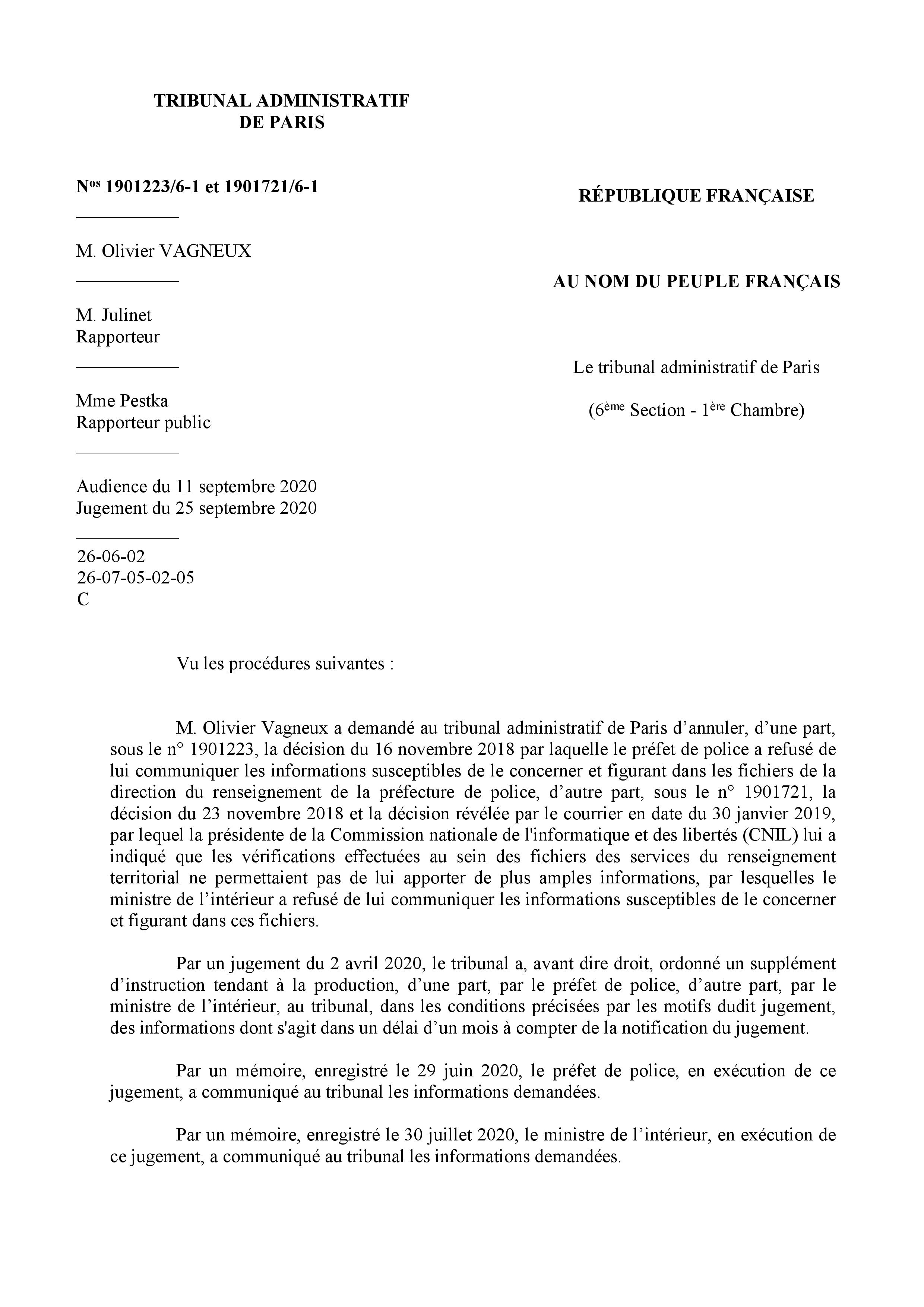 Lors de l’audience du 11 septembre 2020, à laquelle je suis intervenu pour dénoncer l’absurdité du système, déjà la rapporteure publique a commis l’impair de dire, même si elle s’est reprise de suite, que la préfecture de police et le ministère de l’Intérieur avaient communiqué des éléments me concernant, ce qui sous-entendait déjà qu’il en existait donc que je suis fiché.