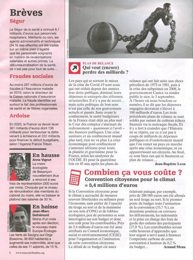 Un fidèle lecteur (ou une fidèle lectrice) m’a fait parvenir au courrier avec une note, sous pli anonyme, la dernière édition de l’association Contribuables associés (n°16 – septembre à novembre 2020). Qu’il ou elle en soit remercié(e), comme tous mes autres informateurs.