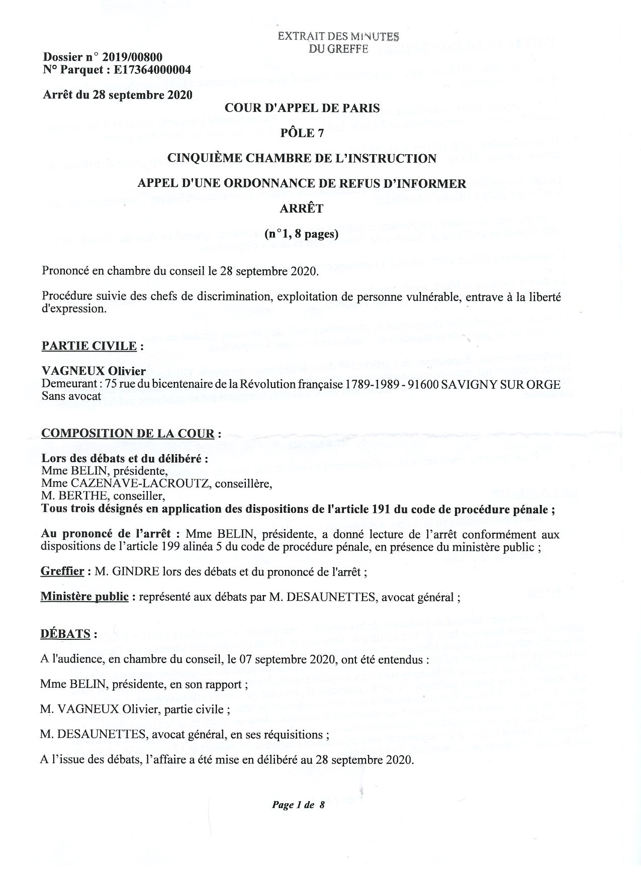 J’en suis donc pour l’instant à avoir obtenu 100 % de satisfaction devant la chambre de l’instruction près la Cour d’appel de Paris avec deux appels gagnés sur deux ! Je suis content de ces victoires.
