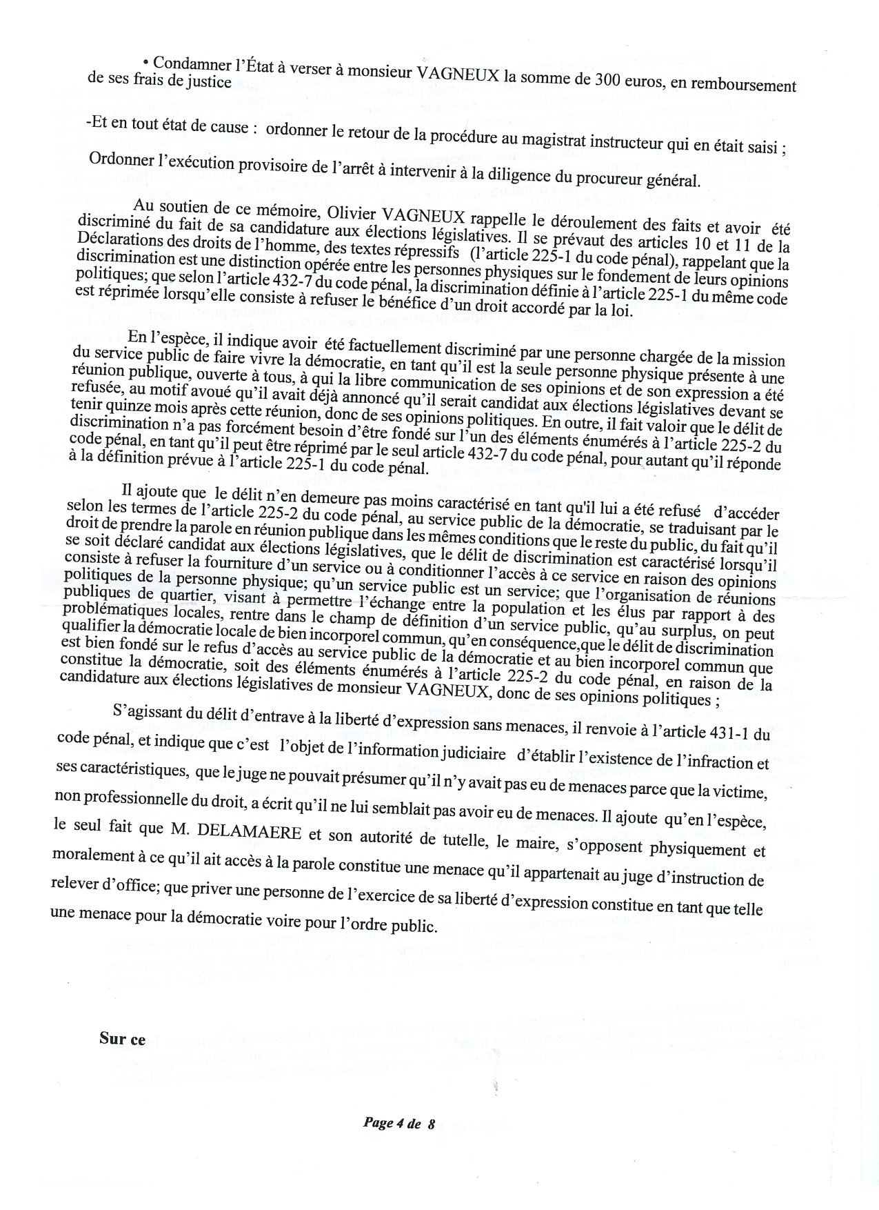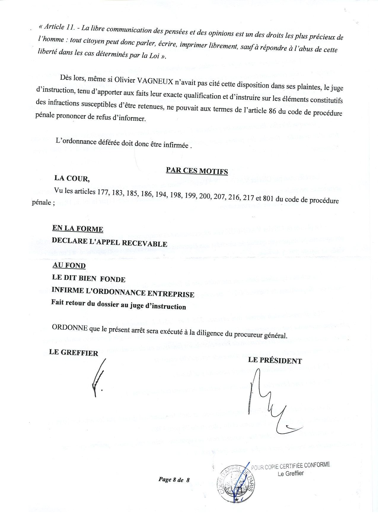 Le motif de l’infirmation de l’ordonnance de refus d’informer est que la juge d’instruction aurait dû relever d’office que MM. MEHLHORN et DELAMAERE ont commis un délit d’atteinte à ma liberté fondamentale d’expression, garantie par les articles 10 et 11 de la Déclaration des droits de l’Homme et du citoyen de 1789.