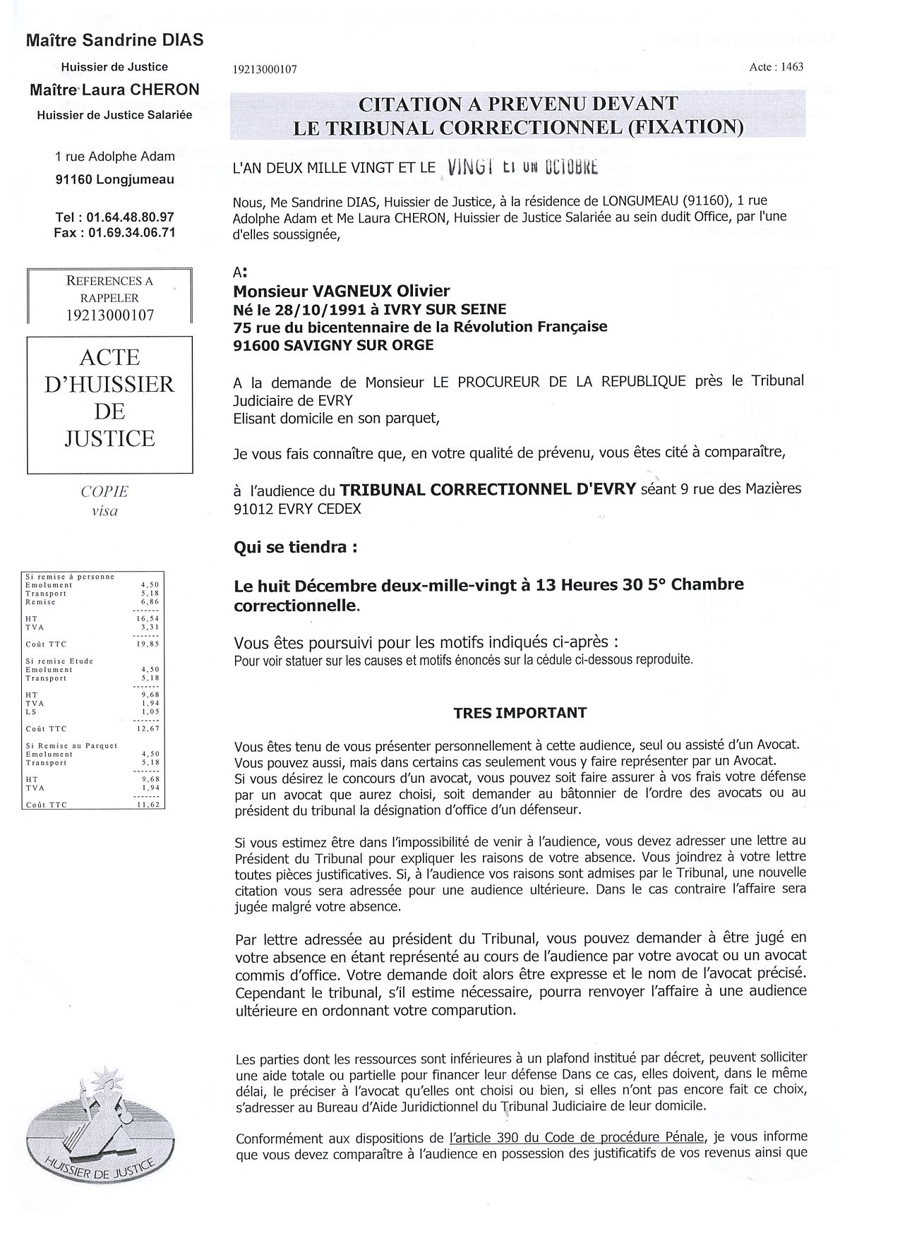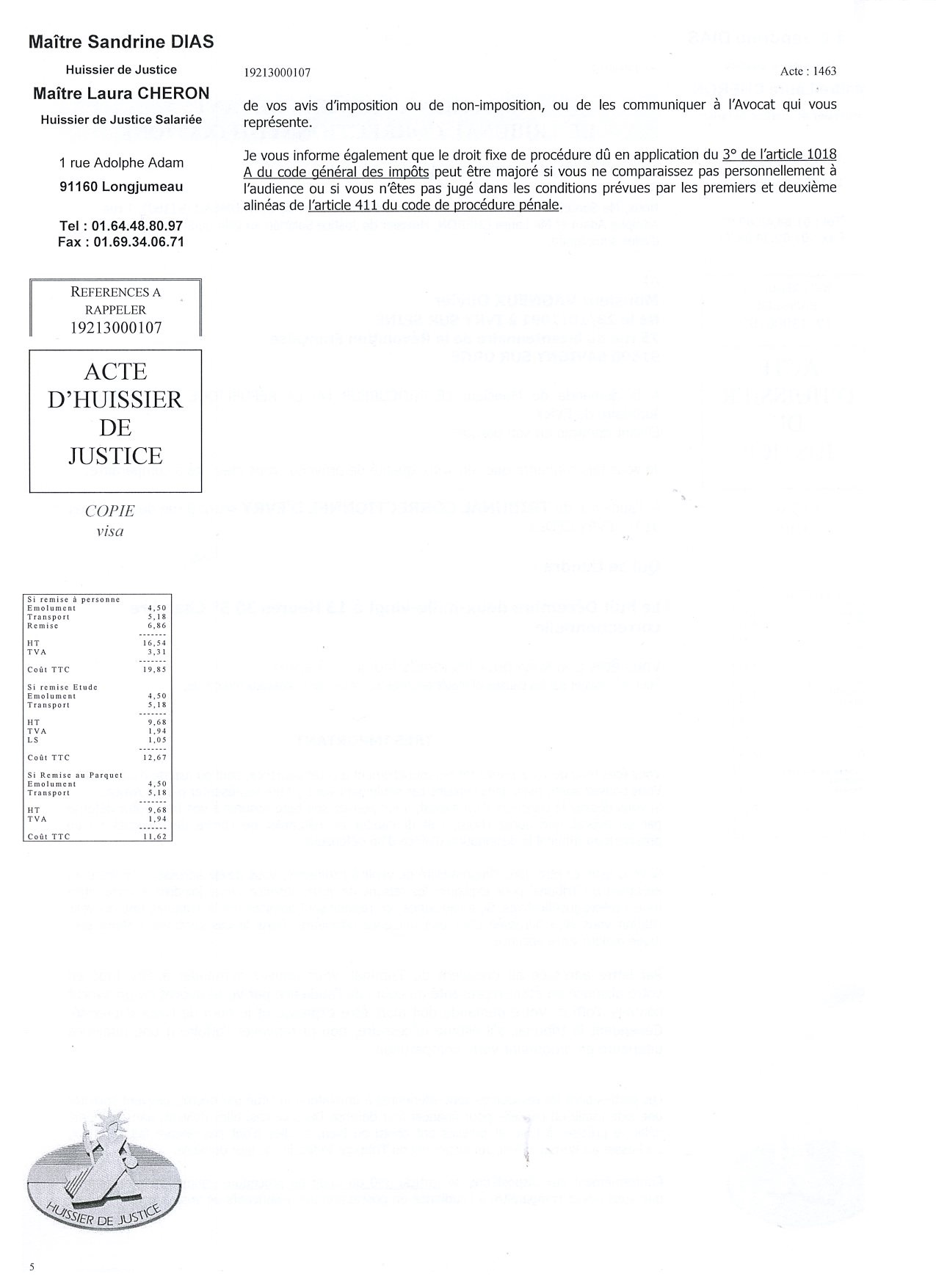 Au passage, et puisque c’est un homme qui m’a apporté le document, vous observerez qu’il manque le nom du clerc assermenté qui m’a délivré l’exploit d’huissier.
