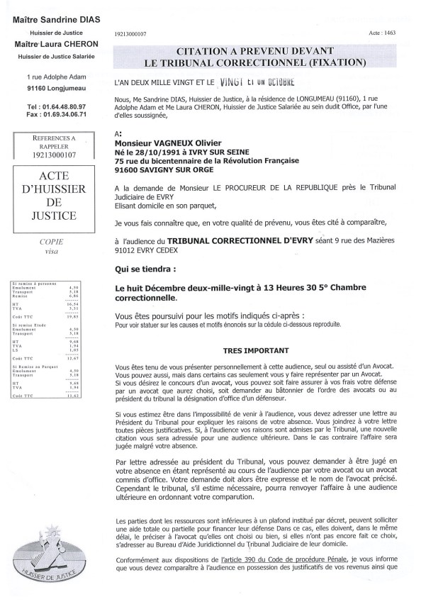 - J’ai pu en profiter pour accéder au premier bulletin de mon casier judiciaire et découvrir que celui-ci était toujours immaculé, parce que la Cour de cassation n’a toujours pas transmis qu’elle avait rejeté en mars 2018 mon pourvoi dans mon affaire contre MEHLHORN. Je prévois toujours de demander la révision du procès lorsque j’aurais obtenu toutes les productions de Valérie RAGOT, que ô surprise, DEFRÉMONT couvre !!!