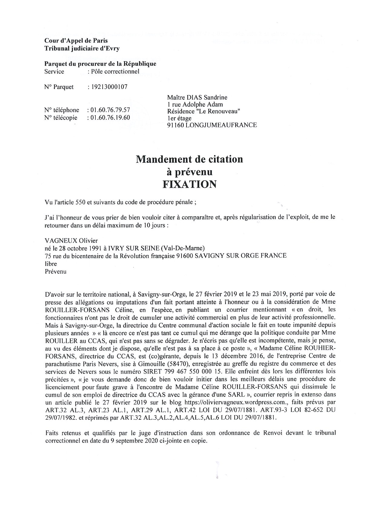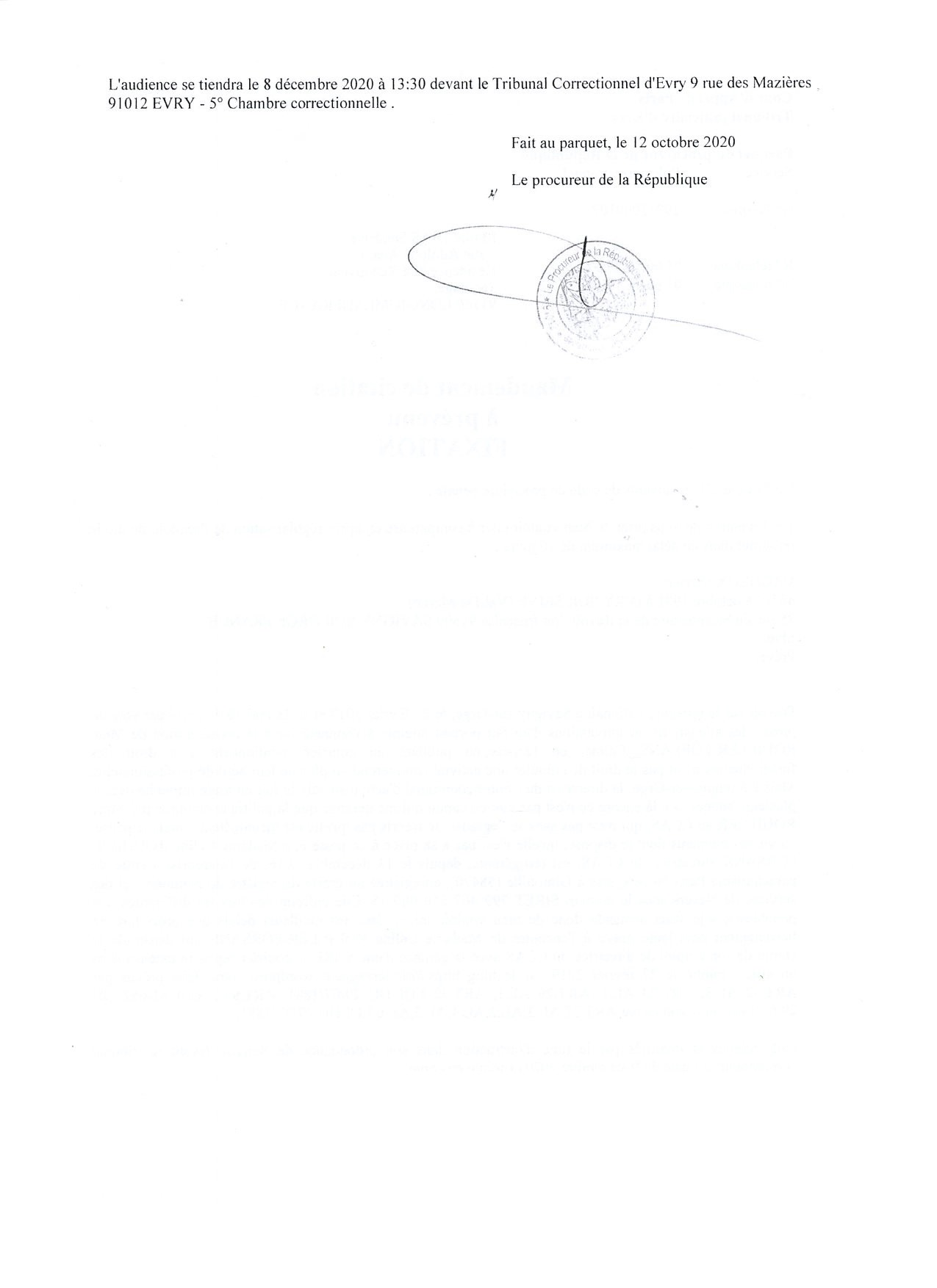 Cette mise en examen a été levée le 09 septembre 2020 lorsque la juge d’instruction a ordonné mon renvoi devant le Tribunal correctionnel.