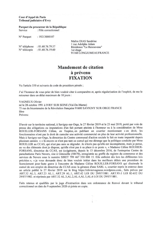 Bref, je vous inviterai quand je plaiderai réellement, dans les six mois environ. La plainte en dénonciation calomnieuse a déjà été portée, en novembre 2019.