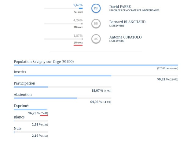 Mais puisque nous avons établi samedi que les 140 bulletins CURATOLO n’étaient pas valides, par infraction à l’article R.66-2-1° du code électoral, alors le total de suffrages exprimés n’est plus que de 7 309, ce qui établit un seuil de qualification pour le second tour à 731 voix.