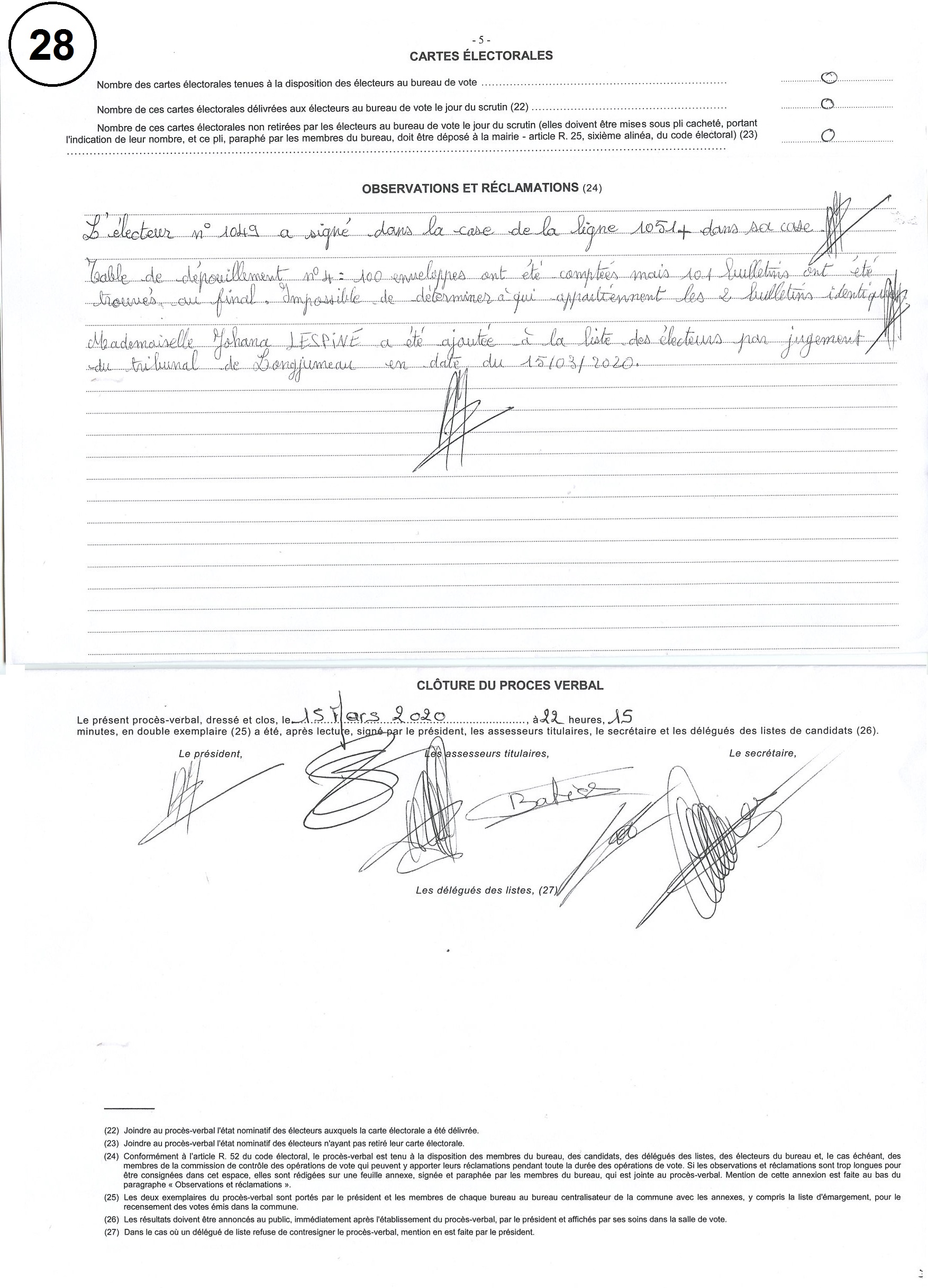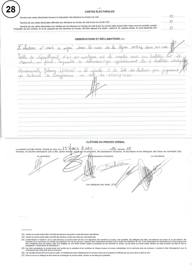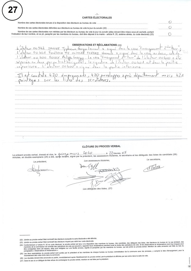 Et donc les signatures sont différentes entre les deux tours pour 32 personnes à coup sûr et probablement pour 20 autres personnes ; lesquelles sont toutes censées être venues voter en personne !