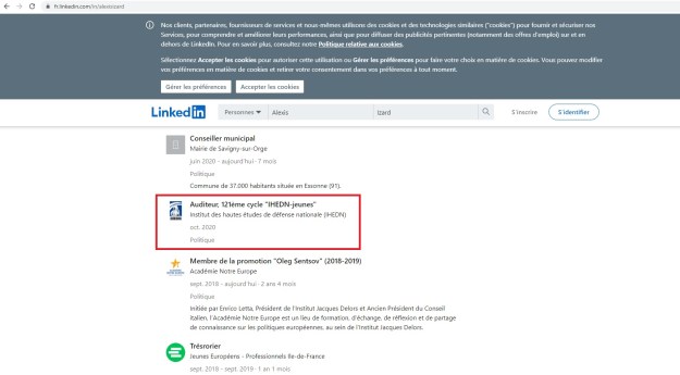 Or, en creusant un petit peu, sur le compte LinkedIn d’Alexis IZARD, on découvre qu’il s’agit en fait d’une session jeunes, qui vient de commencer en octobre 2020, et qui n’a de l’IHEDN que le nom.
