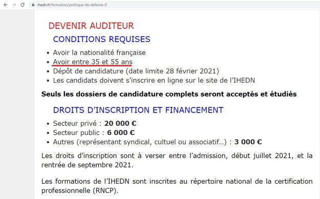 Or, pour ceux qui comme moi connaissent un peu l’IHEDN, parce que je l’ai fréquenté un mois en avril 2014 et en avril 2015 lorsque je faisais de la communication de guerre à l’École militaire dans le cadre de l’Exercice Coalition, ce qui me permettait à la fois de déjeuner à tarif préférentiel au mess des officiers et en même temps d’assister aux conférences réservées aux auditeurs de l’IHEDN (et je me rappelle notamment de l’intervention d’AUNG San Suu Kyi en avril 2014 qui m’a le plus marquée), ils savent qu’il n’est pas possible de l’intégrer avant 35 ans !!!