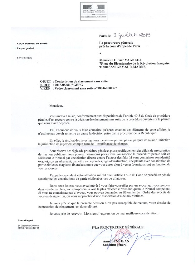 Du coup, ma plainte pour abus de pouvoir et abus de position dominante, DAVIN ayant de toute façon renvoyé la faute sur les élus, qui eux se seraient déchargés sur lui, est un peu tombée à plat, et c’est d’ailleurs ce que m’écrit la procureure générale près la Cour d’appel de Paris : insuffisance de charges.
