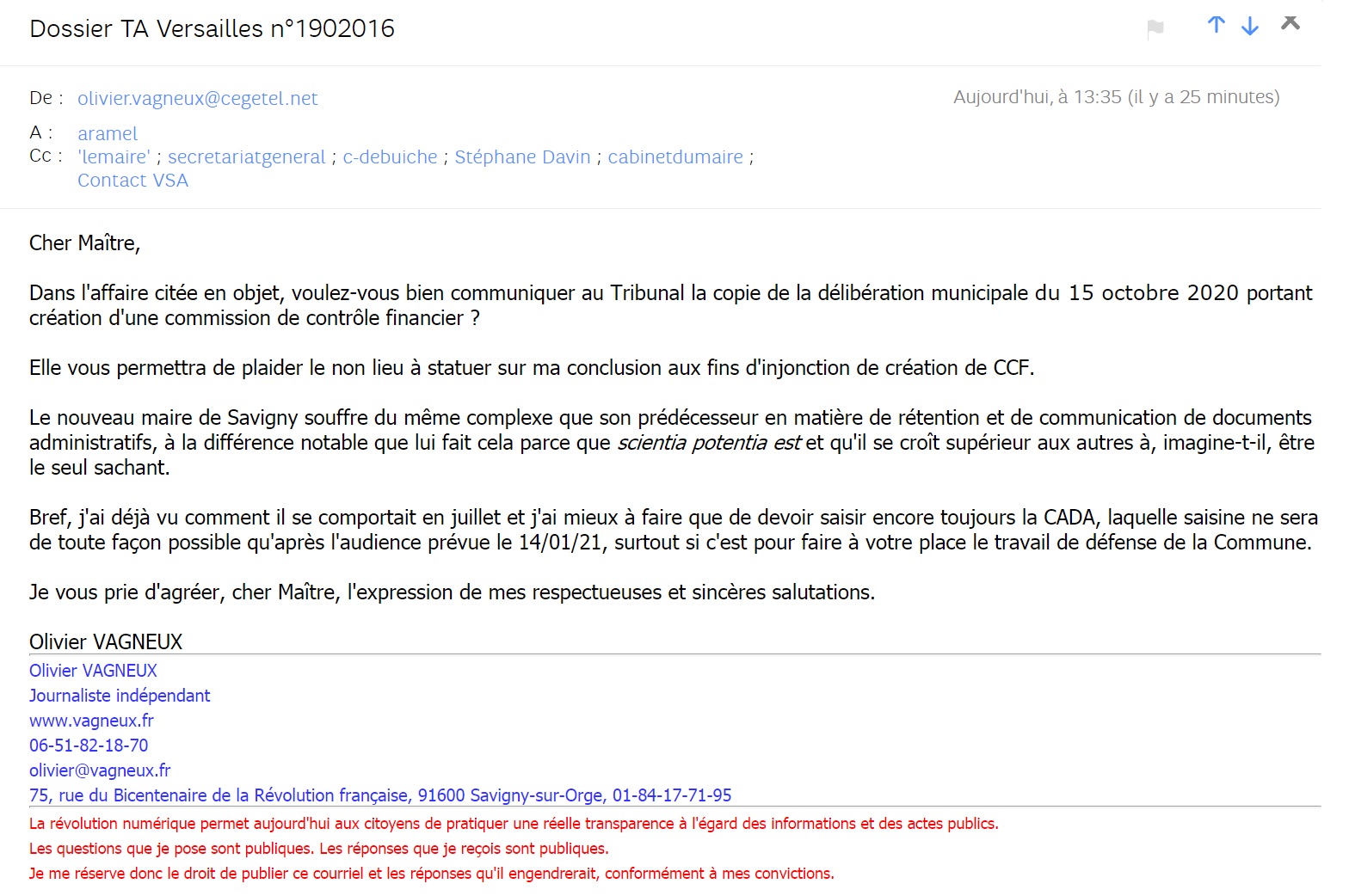 Au hasard d’un courriel envoyé à l’avocat de la Commune pour lui expliquer ce qu’il devait plaider dans les intérêts des Saviniens…