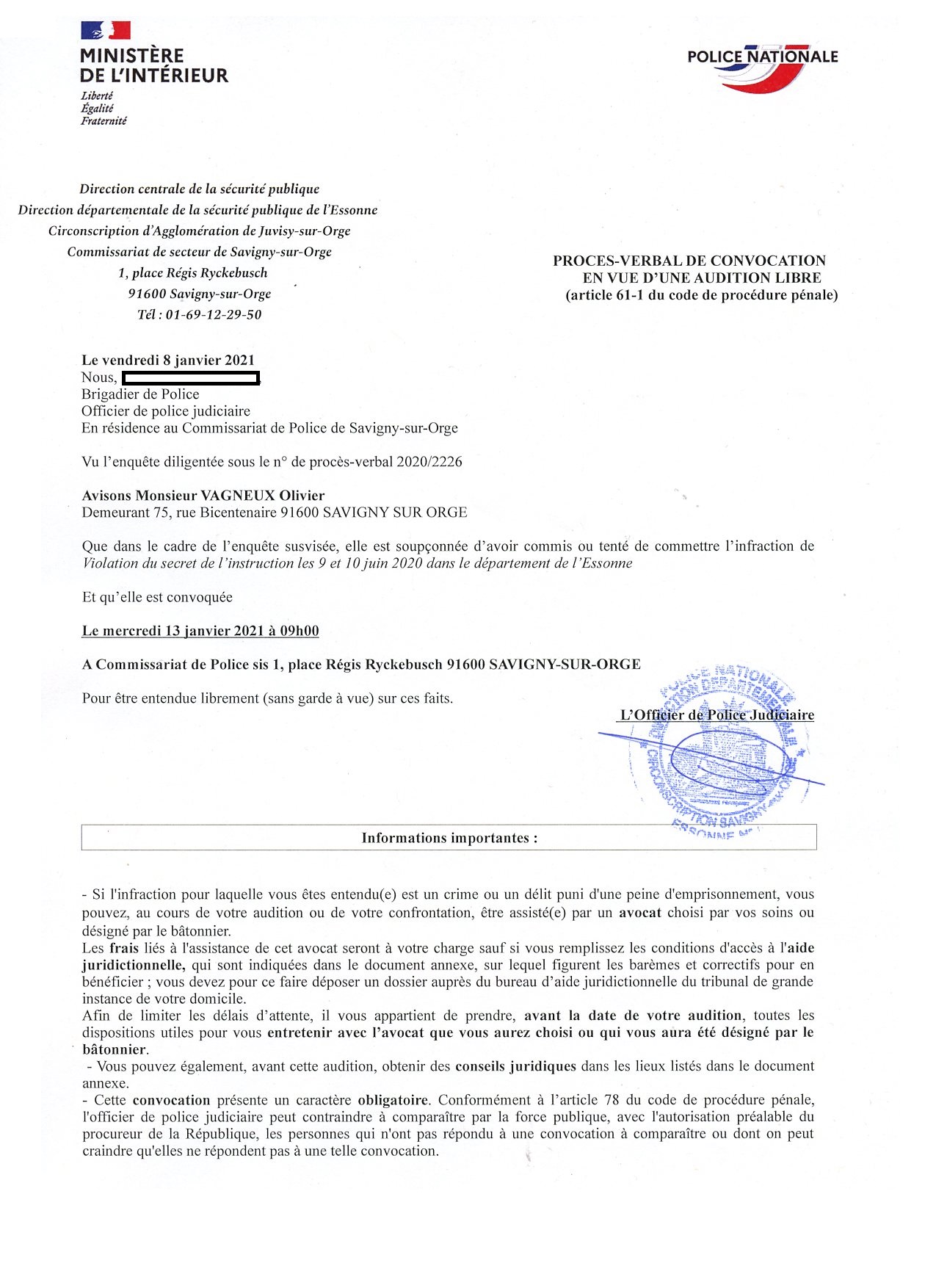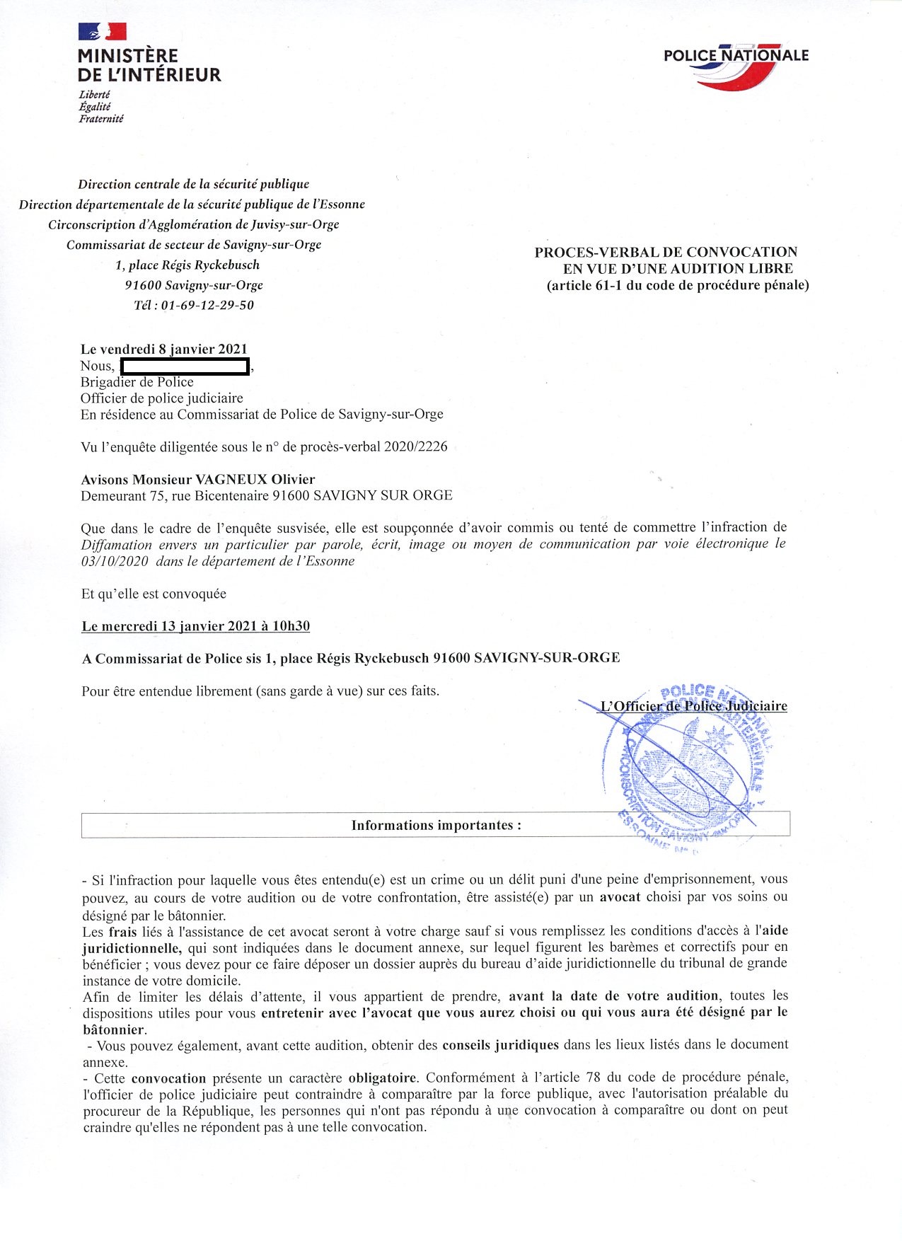Les trois convocations portent le même numéro de procédure, ce qui est anormal, et on m’y désigne avec le pronom personnel « elle ».
