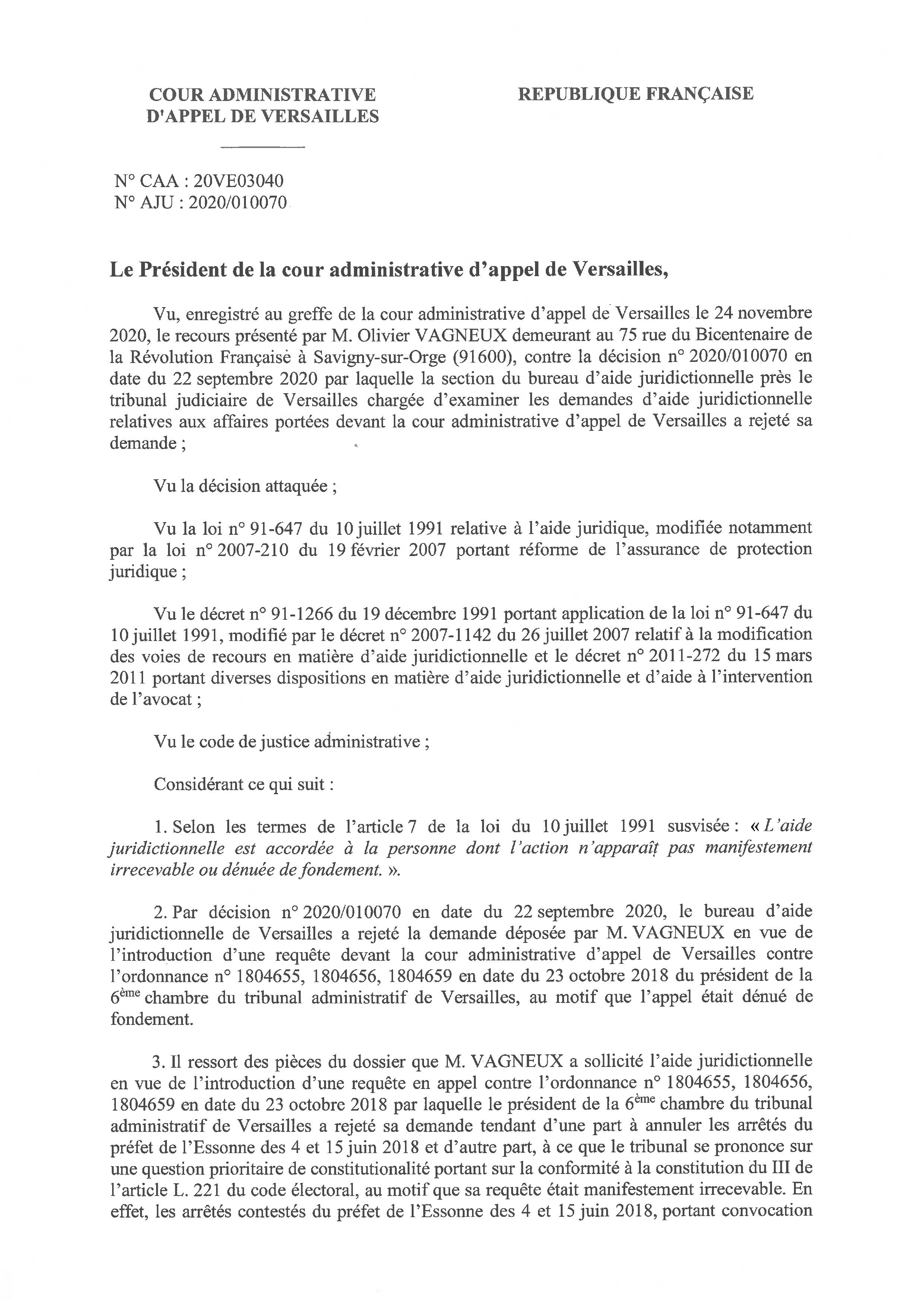 Ensuite, on va reconnaître que si moi-même, j’avais dû juger mon affaire, je ne me serais pas accordé l’aide juridictionnelle parce que j’avais effectivement attaqué les arrêtés préfectoraux en tant qu’actes préparatoires, et donc non-détachables, des opérations électorales.