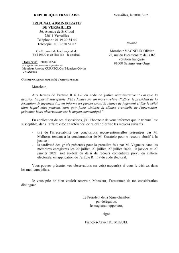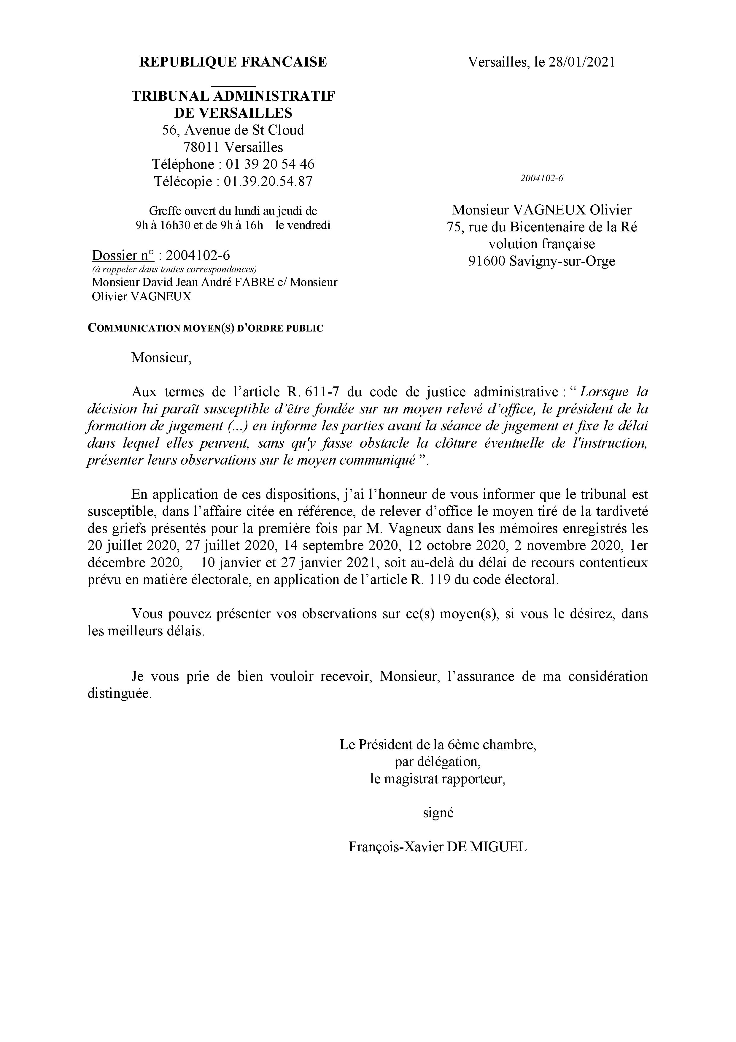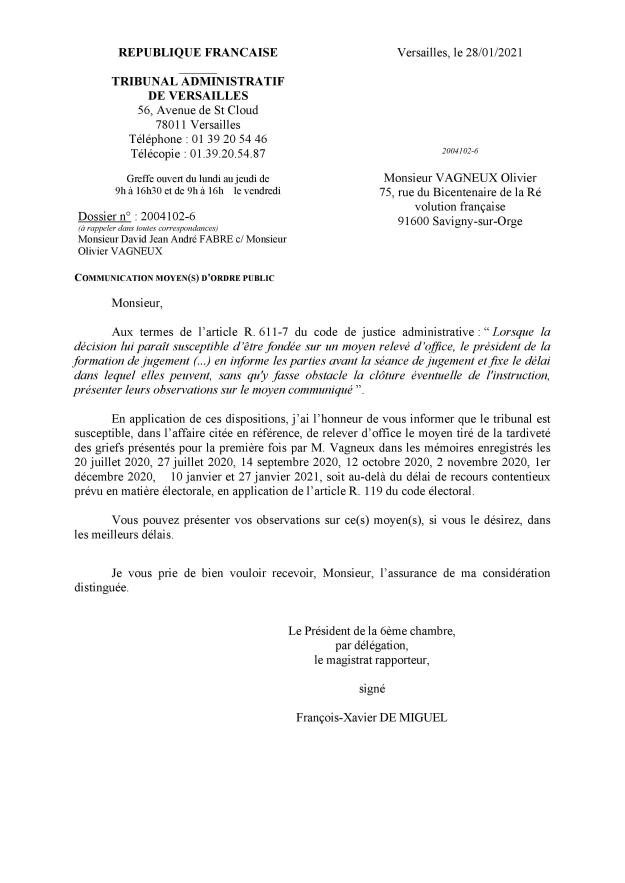 Dans les deux affaires d’annulation des élections municipales à Savigny, le rapporteur a soulevé des moyens d’ordre public, qui sont des arguments que le juge peut décider d’écarter d’office. Et le juge a décidé d’écarter tous mes nouveaux griefs (tous les vices que je soulève pour justifier l’annulation de l’élection) au motif qu’ils seraient tardifs.