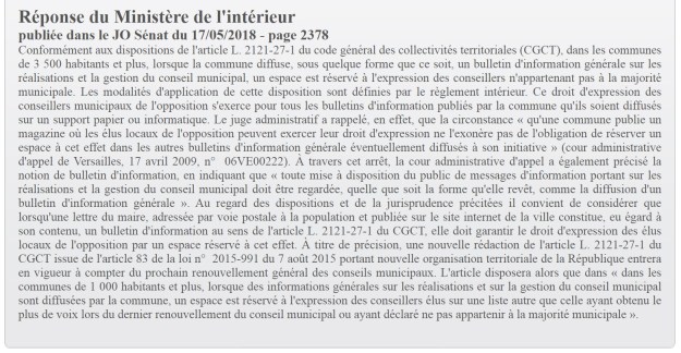 Donc c’est quand même la deuxième fois que DEFRÉMONT nous fait le coup d’un communiqué du maire, sans mentions légales d’impression, dans lequel il ne donne aucune place à son opposition, au mépris de l’article L.2121-27-1 du code général des collectivités territoriales. Il n’a pas le droit de faire cela et l’article du règlement intérieur du Conseil municipal qui réserve les tribunes d’opposition au seul bulletin municipal est illégal. N’importe qui pourra le faire sauter par exception d’illégalité.