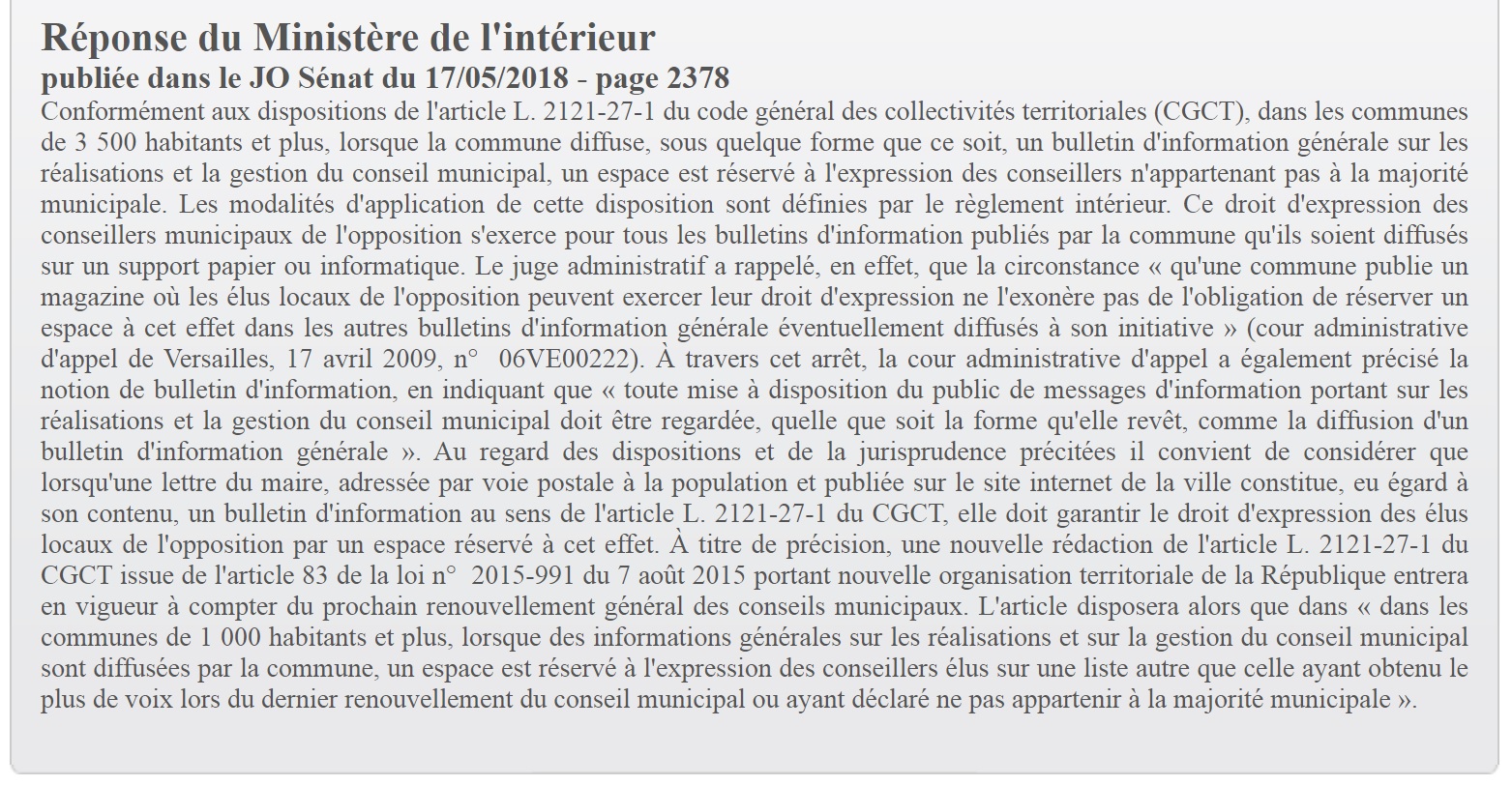 Donc c’est quand même la deuxième fois que DEFRÉMONT nous fait le coup d’un communiqué du maire, sans mentions légales d’impression, dans lequel il ne donne aucune place à son opposition, au mépris de l’article L.2121-27-1 du code général des collectivités territoriales. Il n’a pas le droit de faire cela et l’article du règlement intérieur du Conseil municipal qui réserve les tribunes d’opposition au seul bulletin municipal est illégal. N’importe qui pourra le faire sauter par exception d’illégalité.