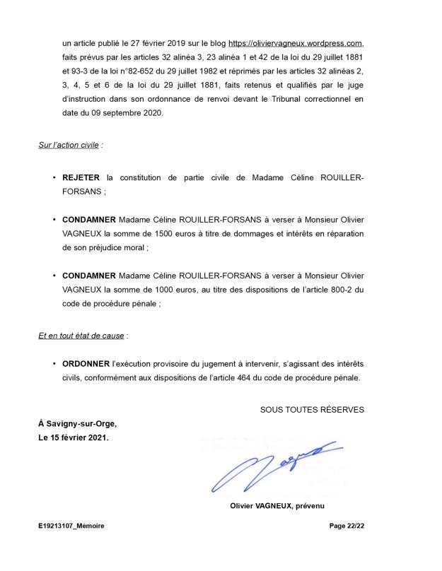 d’avoir sur le territoire national, à Savigny-sur-Orge, le 27 février 2019 et le 23 mai 2019, porté par voie de presse des allégations ou imputations d’un fait portant atteinte à l’honneur ou à la considération de Mme ROUILLER-FORSANS Céline, en l’espèce, en publiant mentionnant “en droit, les fonctionnaires n’ont pas le droit de cumuler une activité commerciale en plus de leur activité professionnelle. Mais à Savigny-sur-Orge, la directrice du Centre communal d’action sociale le fait en toute impunité depuis plusieurs années”, “là encore, ce n’est pas tant ce cumul qui me dérange que la politique conduite par Mme ROUILLER au CCAS, qui n’est pas sans se dégrader. Je n’écris pas qu’elle est incompétente, mais je pense, au vu des éléments dont je dispose, qu’elle n’est pas à sa place à ce poste.”, “Madame Céline ROUILLER-FORSANS, directrice du CCAS, est (co-)gérante, depuis le 13 décembre 2016, de l’entreprise Centre de parachutisme Paris Nevers, sise à Gimouille (58470), enregistrée au greffe du registre du commerce et des services de Nevers sous le numéro SIRET 799 467 550 000 15. Elle enfreint dès lors les différentes lois précitées.”, “je vous demande donc de bien vouloir initier dans les meilleurs délais une procédure de licenciement pour faute grave à l’encontre de Madame Céline ROUILLER-FORSANS qui dissimule le cumul de son emploi de directrice du CCAS avec la gérance d’une SARL.”, courrier repris in extenso dans un article publié le 27 février 2019 sur le blog https://oliviervagneux.wordpress.com, faits prévus par les articles 32 alinéa 3, 23 alinéa 1 et 42 de la loi du 29 juillet 1881 et 93-3 de la loi n°82-652 du 29 juillet 1982 et réprimés par les articles 32 alinéas 2, 3, 4, 5 et 6 de la loi du 29 juillet 1881, faits retenus et qualifiés par le juge d’instruction dans son ordonnance de renvoi devant le Tribunal correctionnel en date du 09 septembre 2020.