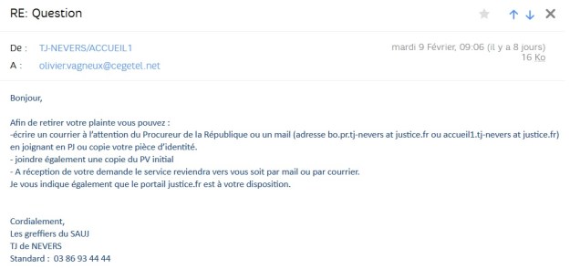 Donc le Tribunal m’a relaxe au motif que j’avais fait preuve de suffisamment de prudence dans mon expression. Il ne m’a cependant accordé aucun dommage et intérêts… Je demandais 1500 euros pour le préjudice moral et 1000 euros pour les frais de Justice.